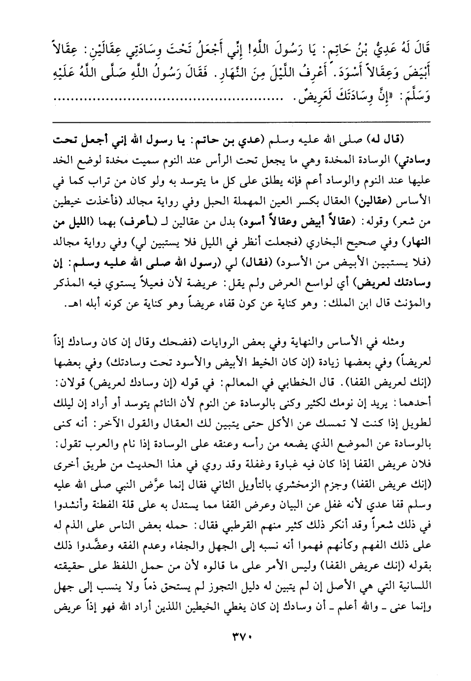 ومثله في الأساس والنهاية وفي بعض الروايات (فضحك وقال إن كان وسادك إذًا لعريضًا) وفي بعضها زيادة (إن كان الخيط الأبيض والأسود تحت وسادتك) وفي بعضها (إنك لعريض القفا). قال الخطابي في المعالم: في قوله (إن وسادك لعريض) قولان: أحدهما: يريد إن نومك لكئير وكنى بالوسادة عن النوم لأن النائم يتوسد أو أراد إن ليلك لطويل إذا كنت لا تمسك عن الأكل حتَّى يتبين لك العقال والقول الآخر: أنَّه كنى بالوسادة عن الموضع الَّذي يضعه من رأسه وعنقه على الوسادة إذا نام والعرب تقول: فلان عريض القفا إذا كان فيه غباوة وغفلة وقد روي في هذا الحديث من طريق أخرى (إنك عريض القفا) وجزم الزمخشري بالتأويل الثاني فقال إنما عرَّض النبي صلى الله عليه وسلم قفا عدي لأنه غفل عن البيان وعرض القفا مما يستدل به على قلة الفطنة وأنشدوا في ذلك شعرًا وقد أنكر ذلك كثير منهم القرطبي فقال: حمله بعض الناس على الذم له على ذلك الفهم وكأنهم فهموا أنَّه نسبه إلى الجهل والجفاء وعدم الفقه وعضَّدوا ذلك بقوله (إنك عريض القفا) وليس الأمر على ما قالوه لأن من حمل اللفظ على حقيقته اللسانية التي هي الأصل إن لم يتبين له دليل التجوز لم يستحق ذمًّا ولا ينسب إلى جهل وإنما عنى - والله أعلم - أن وسادك إن كان يغطي الخيطين اللذين أراد الله فهو إذًا عريض