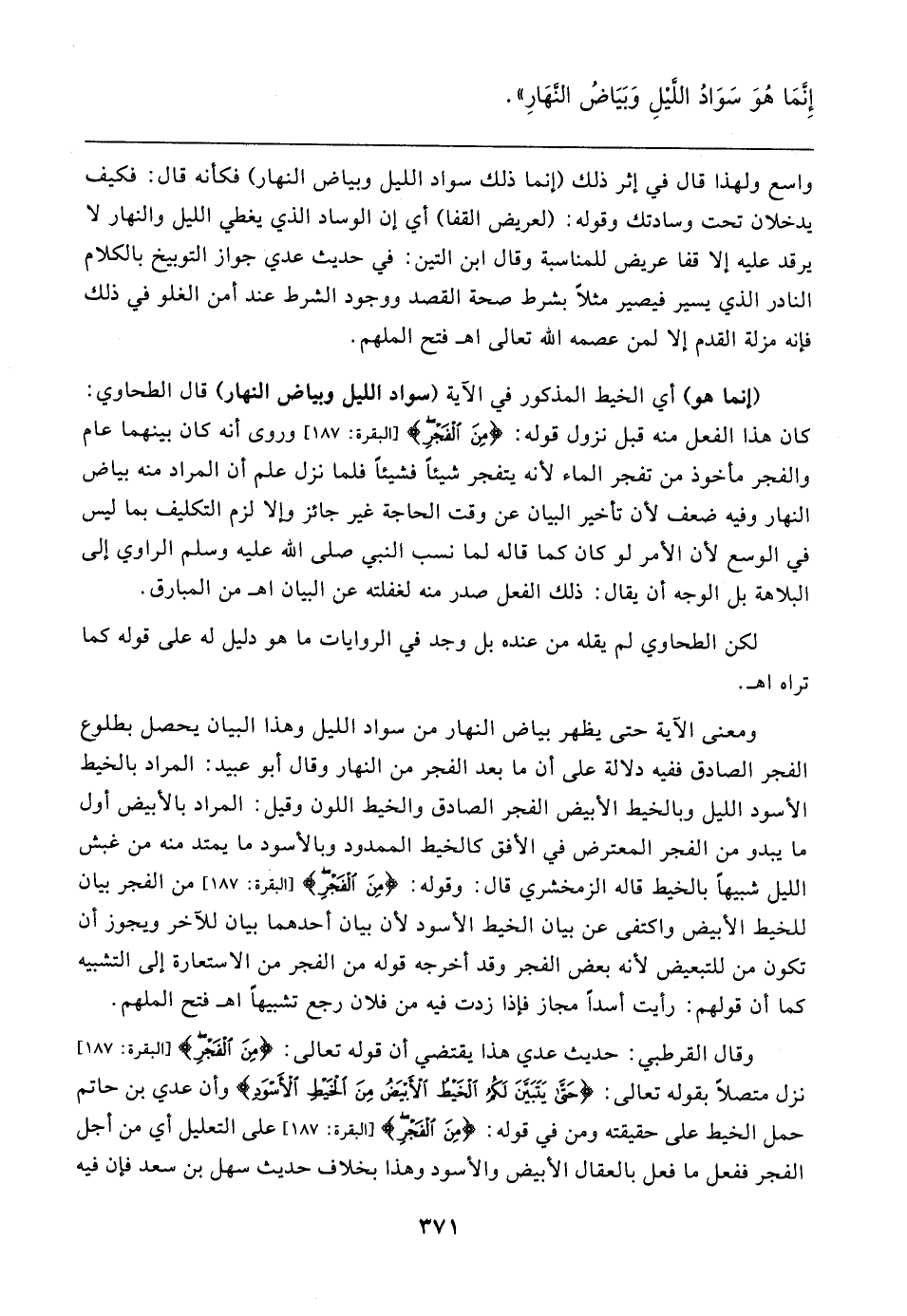 ومعنى الآية حتَّى يظهر بياض النهار من سواد الليل وهذا البيان يحصل بطلوع الفجر الصادق ففيه دلالة على أن ما بعد الفجر من النهار وقال أبو عبيد: المراد بالخيط الأسود الليل وبالخيط الأبيض الفجر الصادق والخيط اللون وقيل: المراد بالأبيض أول ما يبدو من الفجر المعترض في الأفق كالخيط الممدود وبالأسود ما يمتد منه من غبش الليل شبيهًا بالخيط قاله الزمخشري قال: وقوله: {مِنَ الْفَجْرِ} [البقرة: ١٨٧] من الفجر بيان للخيط الأبيض واكتفى عن بيان الخيط الأسود لأن بيان أحدهما بيان للآخر ويجوز أن تكون من للتبعيض لأنه بعض الفجر وقد أخرجه قوله من الفجر من الاستعارة إلى التشبيه كما أن قولهم: رأيت أسدًا مجاز فإذا زدت فيه من فلان رجع تشبيهًا اهـ فتح الملهم.