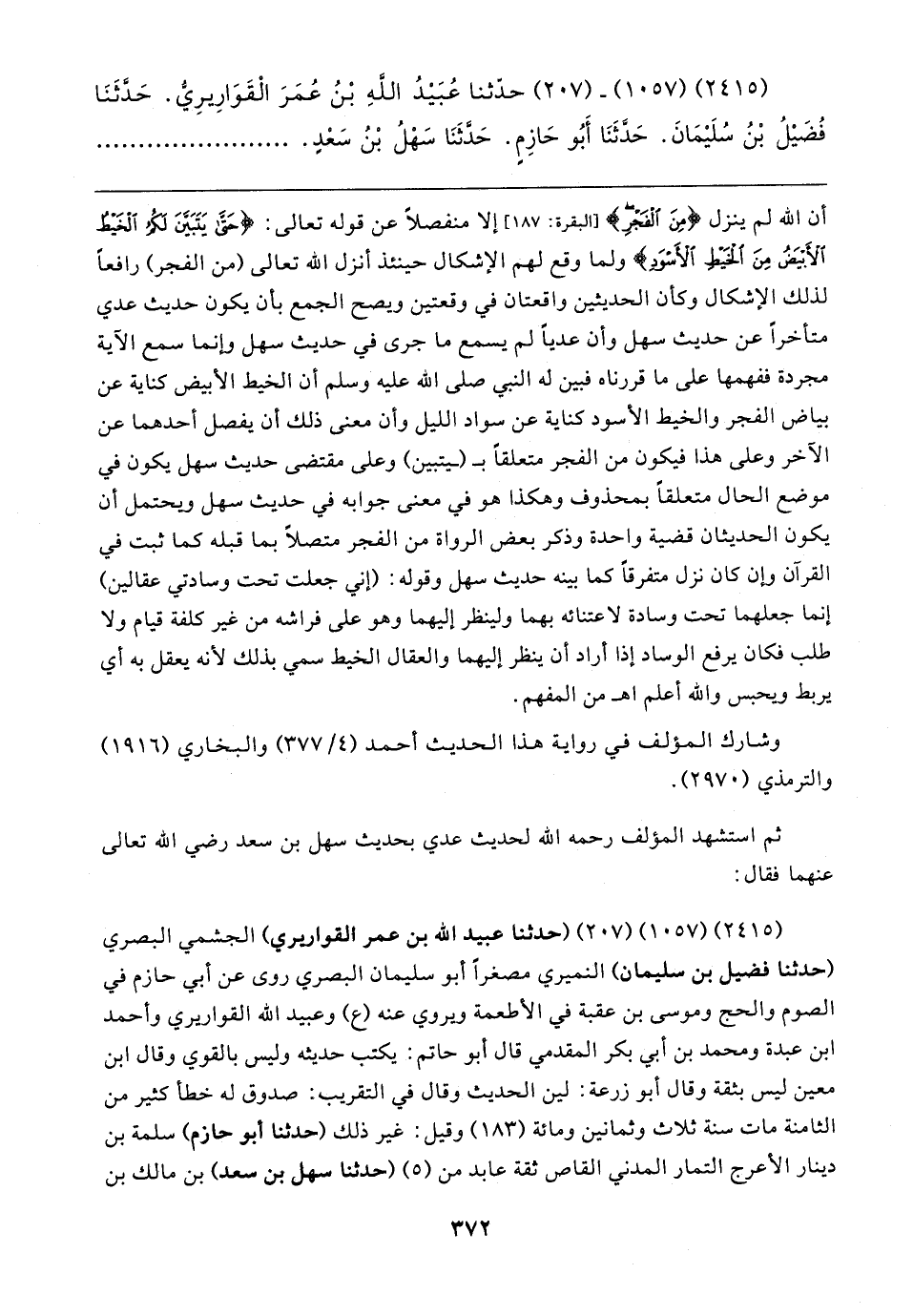 (٢٤١٥) (١٠٥٧) - (٢٠٧) حدَّثنا عُبَيدُ اللهِ بْنُ عُمَرَ الْقَوَارِيرِيُّ. حَدَّثَنَا فُضَيلُ بْنُ سُلَيمَانَ. حَدَّثَنَا أَبُو حَازِمٍ. حَدَّثَنَا سَهْلُ بْنُ سَعْدٍ