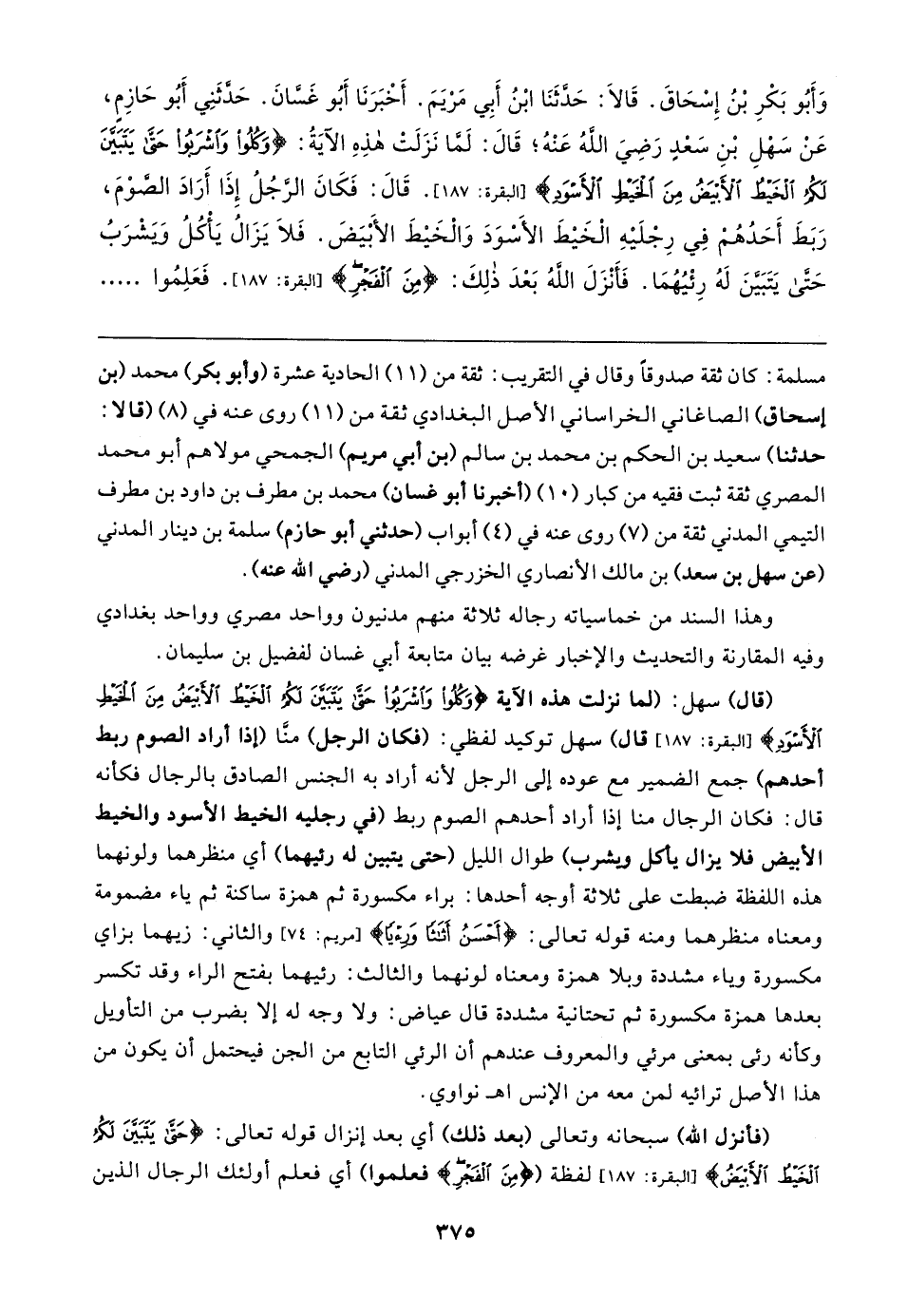 وَأَبُو بَكْرٍ بْنُ إِسْحَاقَ. قَالا: حَدَّثَنَا ابْنُ أَبِي مَرْيَمَ. أَخْبَرَنَا أَبُو غَسَّانَ. حَدَّثَنِي أَبُو حَازِمٍ، عَنْ سَهْلِ بْنِ سَعْدٍ رَضِيَ اللهُ عَنْهُ؛ قَال: لَمَّا نَزَلَتْ هذِهِ الآيَةُ: {وَكُلُوا وَاشْرَبُوا حَتَّى يَتَبَيَّنَ لَكُمُ الْخَيْطُ الْأَبْيَضُ مِنَ الْخَيْطِ الْأَسْوَدِ} [البقرة: ١٨٧]. قَال: فَكَانَ الرَّجُلُ إِذَا أَرَادَ الصَّوْمَ، رَبَطَ أَحَدُهُمْ في رِجْلَيهِ الْخَيْطَ الأَسْوَدَ وَالْخَيطَ الأَبْيَضَ. فَلَا يَزَالُ يَأْكُلُ وَيَشْرَبُ حَتَّى يَتَبَيَّنَ لَهُ رِئْيُهُمَا. فَأَنْزَلَ اللهُ بَعْدَ ذلِكَ: {مِنَ الْفَجْرِ} [البقرة: ١٨٧]. فَعَلِمُوا