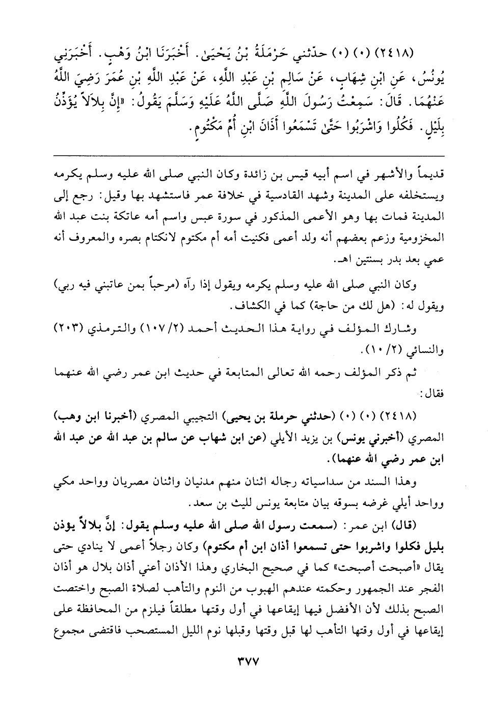 (٢٤١٨) (٠) (٠) حدَّثني حَرْمَلَةُ بْنُ يَحْيَى. أَخْبَرَنَا ابْنُ وَهْبٍ. أَخْبَرَنِي يُونُسُ، عَنِ ابْنِ شِهَابٍ، عَنْ سَالِمِ بْنِ عَبْدِ اللهِ، عَنْ عَبْدِ اللهِ بْنِ عُمَرَ رَضيَ اللهُ عَنْهُمَا. قَال: سَمِعْتُ رَسُولَ اللهِ صَلَّى اللهُ عَلَيهِ وَسَلَّمَ يَقُولُ: "إِن بِلالًا يُؤَذِّنُ بِلَيلٍ. فَكُلُوا وَاشْرَبُوا حَتى تَسْمَعُوا أَذَانَ ابْنِ أُمِّ مَكْتُومٍ
