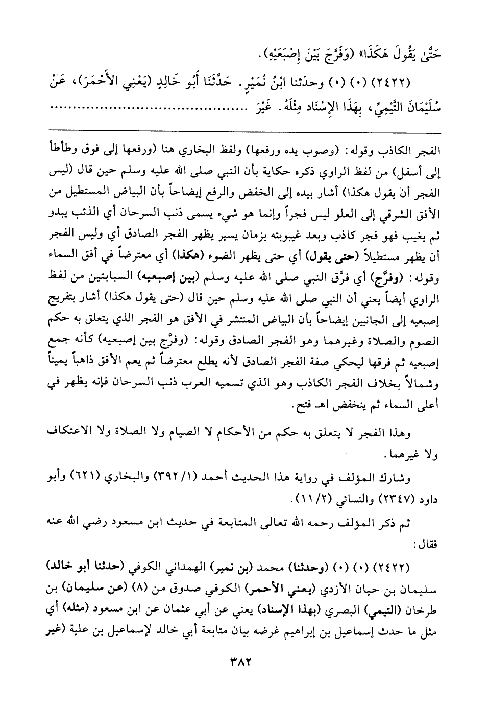 الفجر الكاذب وقوله: (وصوب يده ورفعها) ولفظ البخاري هنا (ورفعها إلى فوق وطأطأ إلى أسفل) من لفظ الراوي ذكره حكاية بأن النبي صلى الله عليه وسلم حين قال اليس الفجر أن يقول هكذا) أشار بيده إلى الخفض والرفع إيضاحًا بأن البياض المستطيل من الأفق الشرقي إلى العلو ليس فجرًا وإنما هو شيء يسمى ذنب السرحان أي الذئب يبدو ثم يغيب فهو فجر كاذب وبعد غيبوبته بزمان يسير يظهر الفجر الصادق أي وليس الفجر أن يظهر مستطيلًا (حتى يقول) أي حتى يظهر الضوء (هكذا) أي معترضًا في أفق السماء وقوله: (وفرَّج) أي فرَّق النبي صلى الله عليه وسلم (بين إصبعيه) السبابتين من لفظ الراوي أيضًا يعني أن النبي صلى الله عليه وسلم حين قال (حتى يقول هكذا) أشار بتفريج إصبعيه إلى الجانبين إيضاحًا بأن البياض المنتشر في الأفق هو الفجر الذي يتعلق به حكم الصوم والصلاة وغيرهما وهو الفجر الصادق وقوله: (وفرَّج بين إصبعيه) كأنه جمع إصبعيه ثم فرقها ليحكي صفة الفجر الصادق لأنه يطلع معترضًا ثم يعم الأفق ذاهبًا يمينًا وشمالًا بخلاف الفجر الكاذب وهو الذي تسميه العرب ذنب السرحان فإنه يظهر في أعلى السماء ثم ينخفض اهـ فتح.