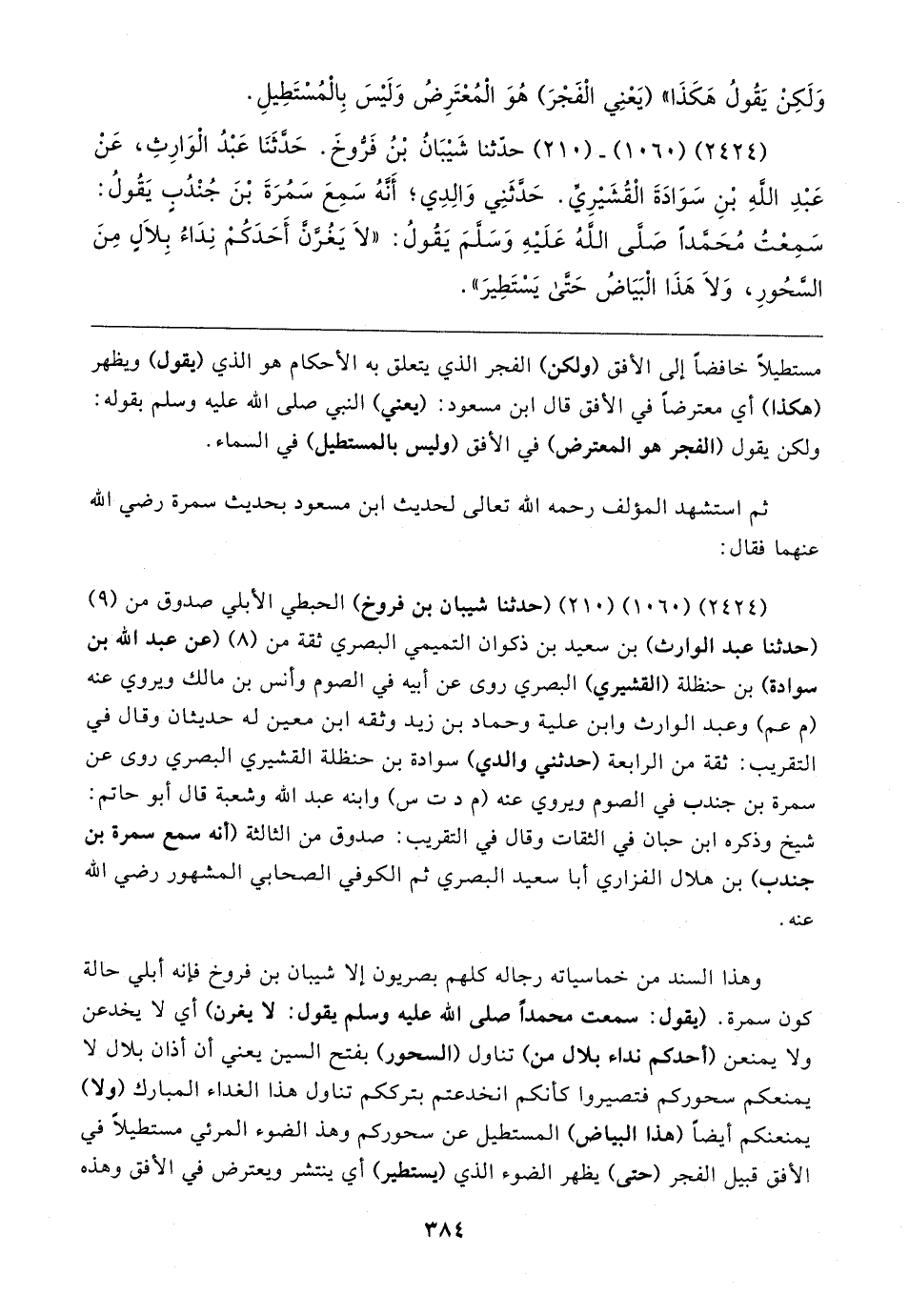 (٢٤٢٤) (١٠٦٥) - (٢١٠) حدَّثنا شَيبَانُ بْنُ فَرُّوخَ. حَدَّثَنَا عَبْدُ الْوَارِثِ، عَنْ عَبْدِ اللهِ بْنِ سَوَادَةَ الْقُشَيرِيِّ. حَدَّثَنِي وَالِدِي؛ أَنَّهُ سَمِعَ سَمُرَةَ بْنَ جُنْدُبٍ يَقُولُ: سَمِعْتُ مُحَمَّدًا صَلَّى اللهُ عَلَيهِ وَسَلَّمَ يَقُولُ: "لَا يَغُرَّنَّ أَحَدَكُمْ نِدَاءُ بِلالٍ مِنَ السَّحُورِ، وَلَا هَذَا الْبَيَاضُ حَتَّى يَسْتَطِيرَ"