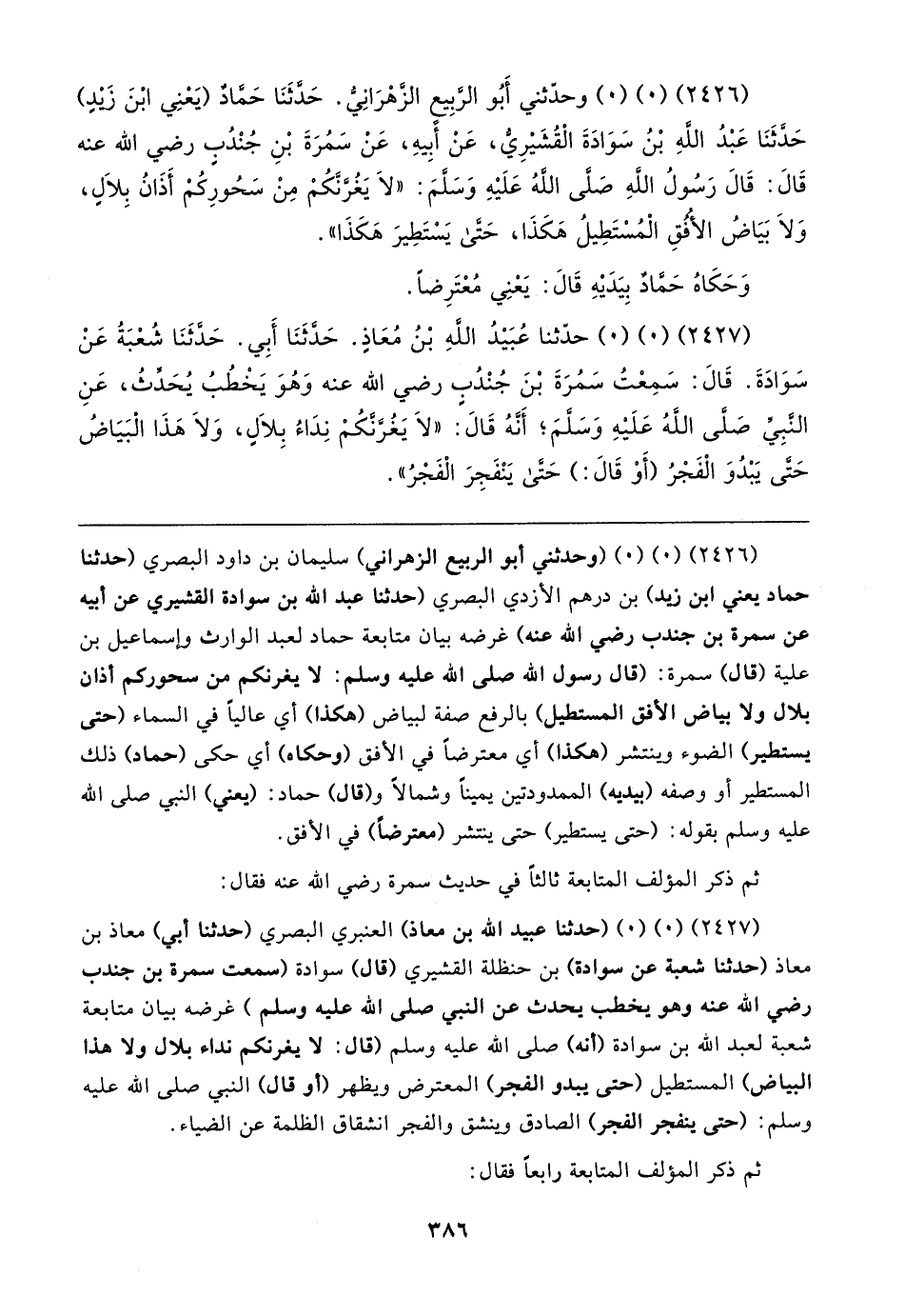 (٢٤٢٦) (٠) (٠) وحدَّثني أَبُو الرَّبِيعِ الزَّهْرَانِيُّ. حَدَّثَنَا حَمَّادٌ (يَعْنِي ابْنَ زَيدٍ) حَدَّثَنَا عَبْدُ اللهِ بْنُ سَوَادَةَ الْقُشَيرِيُّ، عَنْ أبِيهِ، عَنْ سَمُرَةَ بْنِ جُنْدُبٍ رضي الله عنه قَال: قَال رَسُولُ اللهِ صلَّى اللهُ عَلَيهِ وَسَلَّمَ: "لَا يَغُرَّنَّكُمْ مِنْ سَحُورِكُمْ أَذَانُ بِلالٍ، وَلَا بَيَاضُ الأُفُقِ الْمُسْتَطِيلُ هَكَذَا، حَتَّى يَسْتَطِيرَ هَكَذَا".