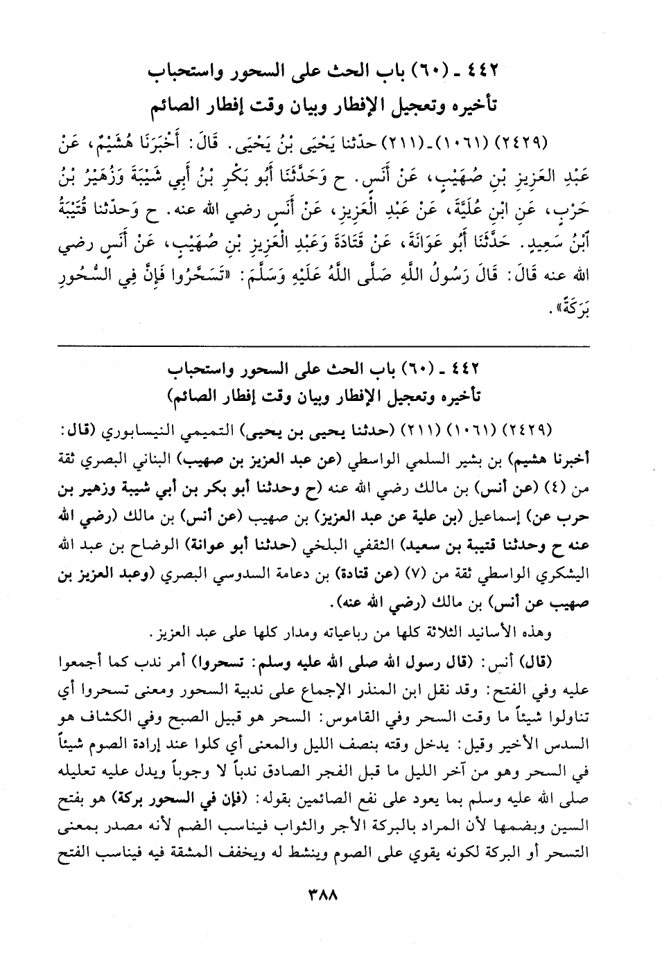 (٢٤٢٩) (١٠٦١) - (٢١١) حدَّثنا يَحْيَى بْنُ يَحْيَى. قَال: أَخْبَرَنَا هُشَيمٌ، عَنْ عَبْدِ العَزِيزِ بْنِ صُهَيبٍ، عَنْ أَنَسٍ. ح وَحَدَّثَنَا أبُو بَكْرِ بْنُ أَبِي شَيبَةَ وَزُهَيرُ بْنُ حَرْبٍ، عَنِ ابْنِ عُلَيَّةَ، عَنْ عَبْدِ الْعَزِيزِ، عَنْ أَنَسٍ رضي الله عنه. ح وَحدّثنا قُتَيبَةُ بْنُ سَعِيدٍ. حَدَّثَنَا أَبُو عَوَانَةَ، عَنْ قَتَادَةَ وَعَبْدِ الْعَزِيزِ بْنِ صُهَيبٍ، عَنْ أَنَسِ رضي الله عنه قَال: قَال رَسُولُ اللهِ صَلَّى اللهُ عَلَيهِ وَسَلَّمَ: "تَسَحَّرُوا فَإِن فِي السُّحُورِ بَرَكَةً"
