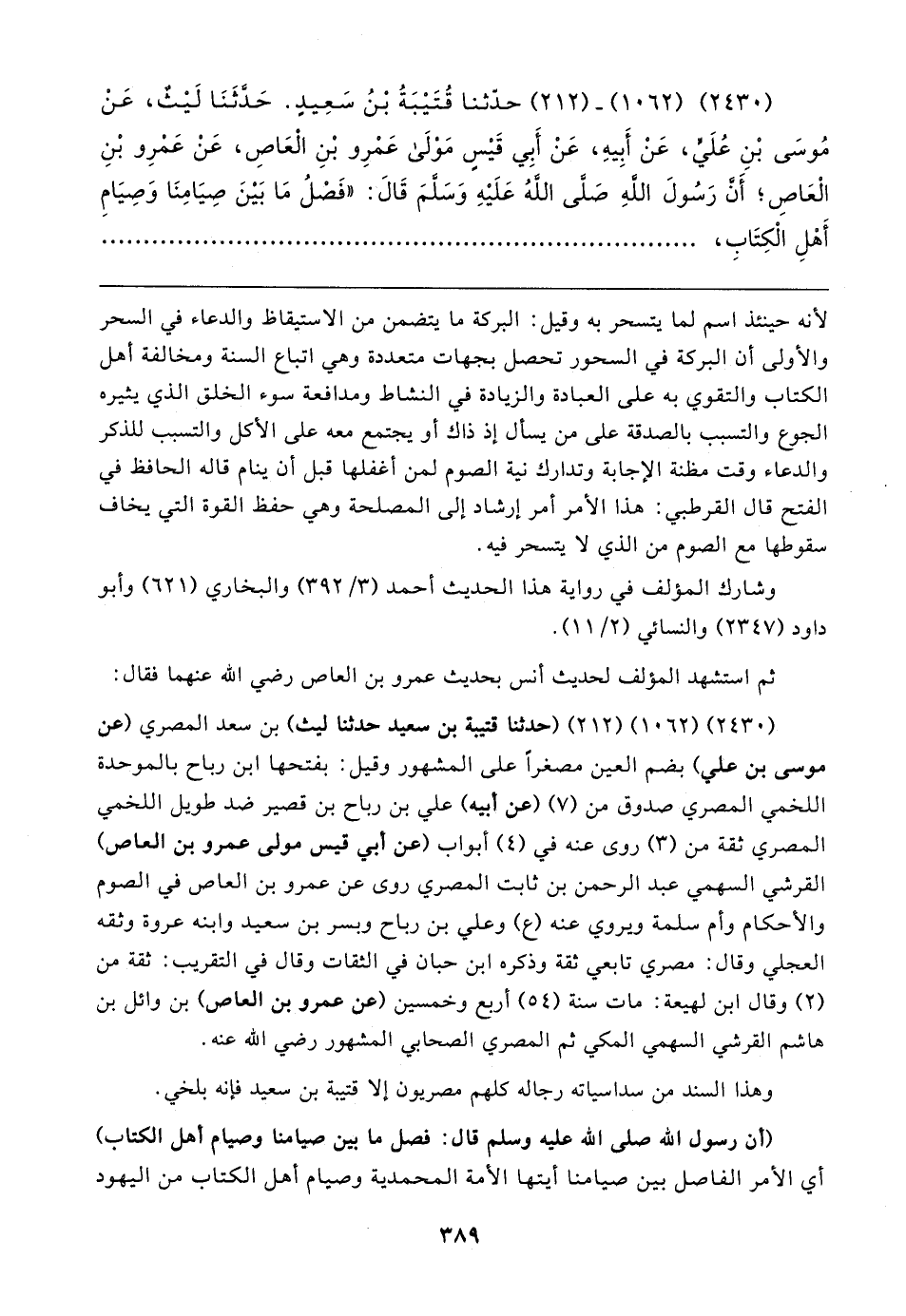 (٢٤٣٥) (١٠٦٢) - (٢١٢) حدَّثنا قُتَيبَةُ بْنُ سَعِيدٍ. حَدَّثَنَا لَيثٌ، عَنْ مُوسَى بْنِ عُلَيٍّ، عَنْ أَبِيهِ، عَنْ أَبِي قَيسِ مَوْلَى عَمْرِو بْنِ الْعَاصِ، عَنْ عَمْرِو بْنِ الْعَاصِ؛ أَنَّ رَسُولَ اللهِ صَلَّى اللهُ عَلَيهِ وَسَلَّمَ قَال: "فَصْلُ مَا بَينَ صِيَامِنَا وَصِيَامِ أهْلِ الْكِتَابِ،