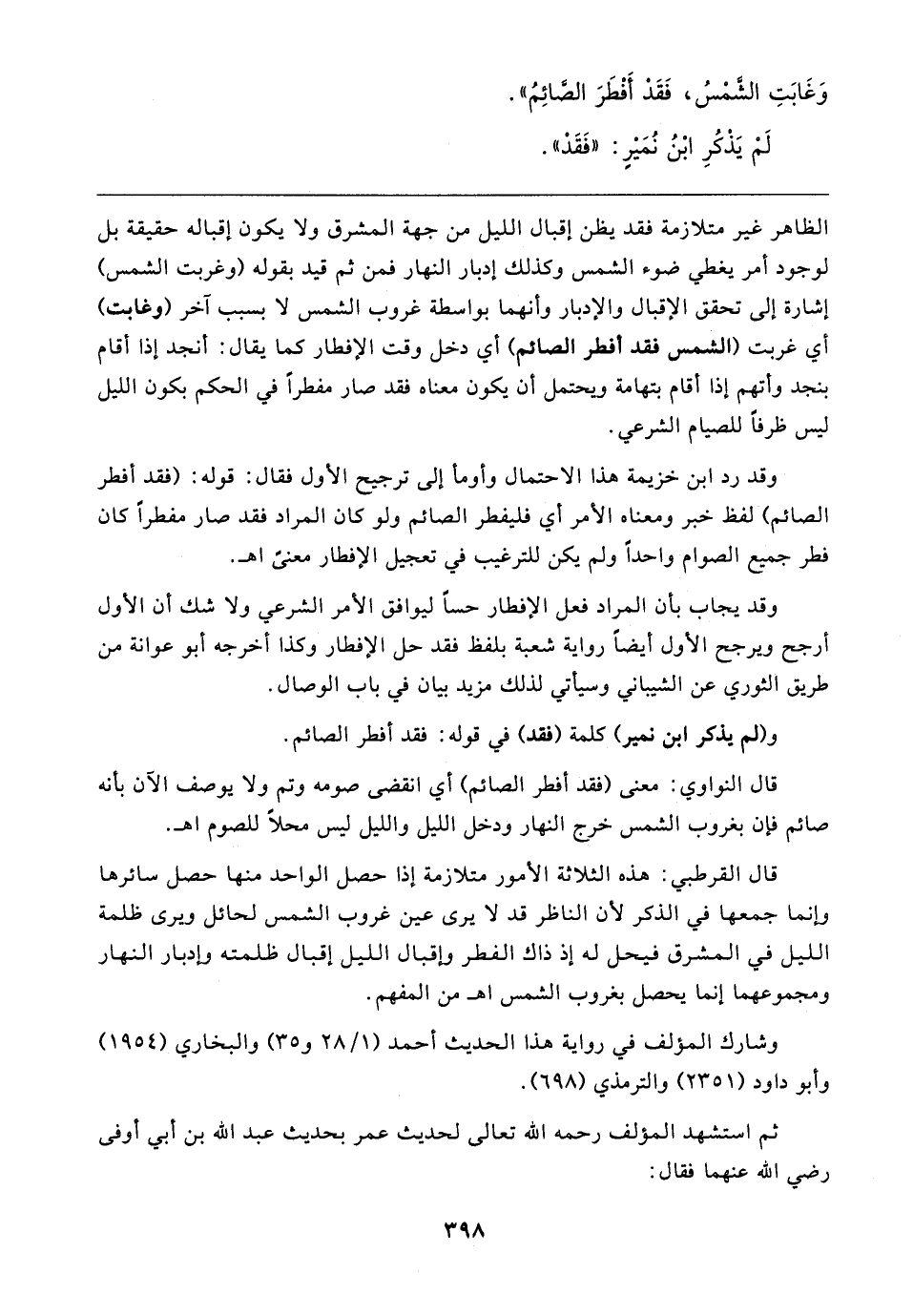 وقد رد ابن خزيمة هذا الاحتمال وأومأ إلى ترجيح الأول فقال: قوله: (فقد أفطر الصائم) لفظ خبر ومعناه الأمر أي فليفطر الصائم ولو كان المراد فقد صار مفطرًا كان فطر جميع الصوام واحدًا ولم يكن للترغيب في تعجيل الإفطار معنىً اهـ.