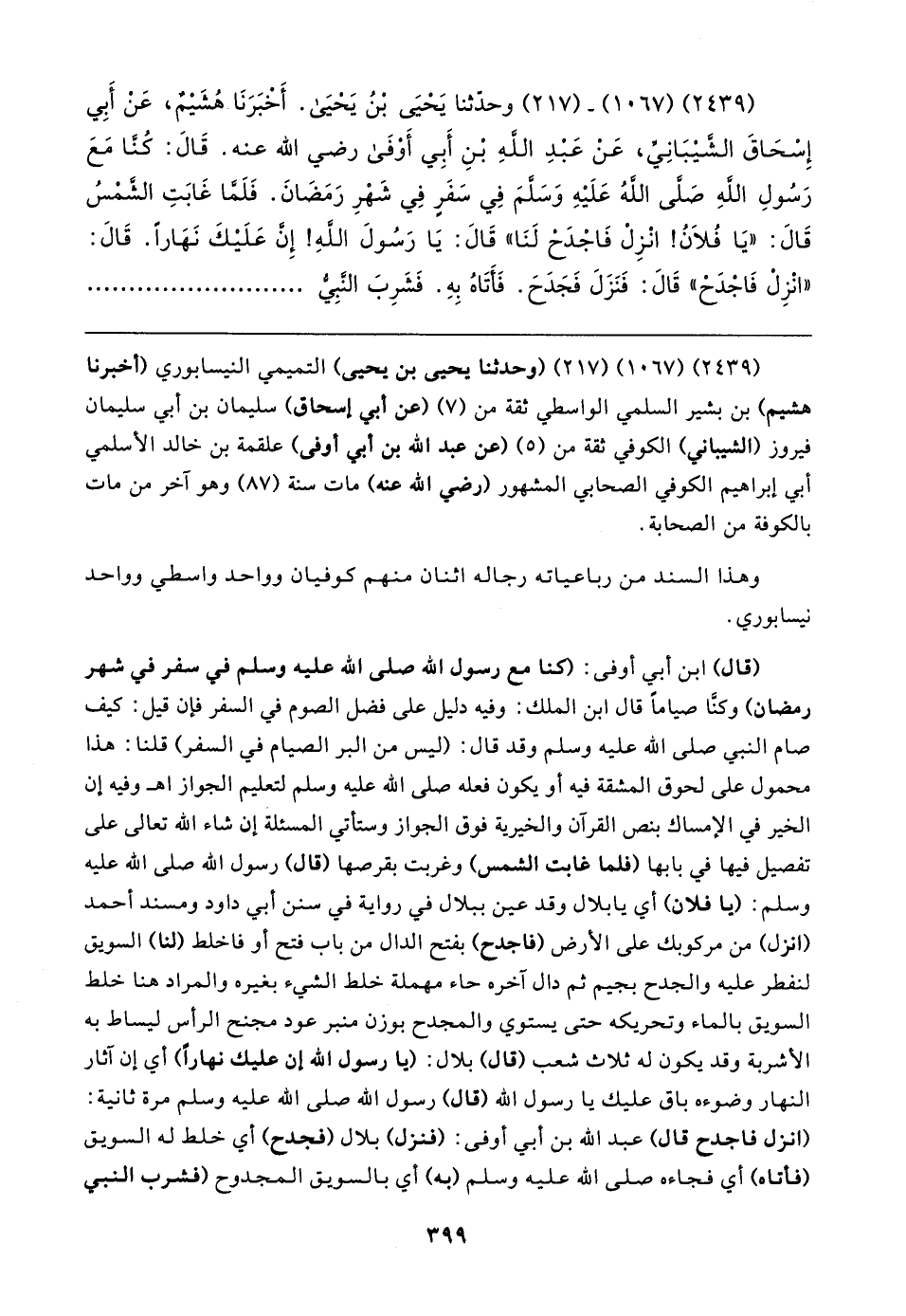 (٢٤٣٩) (١٠٦٧) - (٢١٧) وحدّثنا يَحْيَى بْنُ يَحْيَى. أَخبَرَنَا هُشَيمٌ، عَنْ أَبِي إِسْحَاقَ الشَّيبَانِيِّ، عَنْ عَبْدِ اللهِ بْنِ أَبِي أَوْفَى رضي الله عنه. قَال: كُنَّا مَعَ رَسُولِ اللهِ صَلَّى اللهُ عَلَيهِ وَسَلَّمَ فِي سَفَرٍ فِي شَهْرِ رَمَضَانَ. فَلَمَّا غَابَتِ الشَّمْسُ قَال: "يَا فُلانُ! انْزِلْ فَاجْدَحْ لَنَا" قَال: يَا رَسُولَ اللهِ! إِن عَلَيكَ نَهَارًا. قَال: "انْزِلْ فَاجْدَحْ" قَال: فَنَزَلَ فَجَدَحَ. فَأتَاهُ بِهِ. فَشَرِبَ النَّبِيُّ