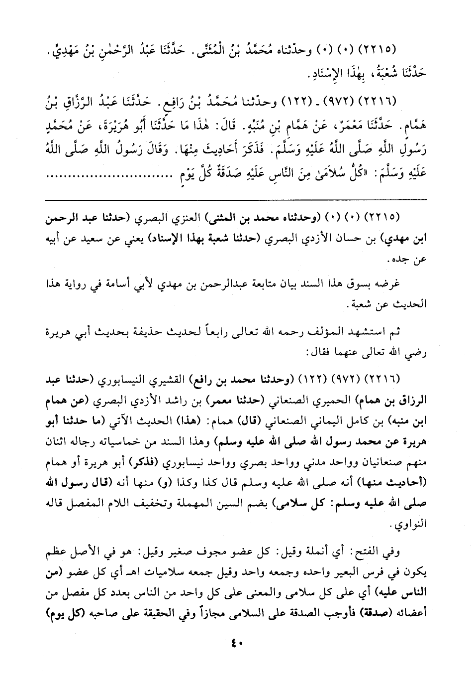 (٢٢١٦) (٩٧٢) (١٢٢) (وحدثنا محمد بن رافع) القشيري النيسابوري (حدثنا عبد الرزاق بن همام) الحميري الصنعاني (حدثنا معمر) بن راشد الأزدي البصري (عن همام بن منبه) بن كامل اليماني الصنعاني (قال) همام: (هذا) الحديث الآتي (ما حدثنا أبو هريرة عن محمد رسول الله صلى الله عليه وسلم) وهذا السند من خماسياته رجاله اثنان منهم صنعانيان وواحد مدني وواحد بصري وواحد نيسابوري (فذكر) أبو هريرة أو همام (أحاديث منها) أنه صلى الله عليه وسلم قال كذا وكذا (و) منها أنه (قال رسول الله صلى الله عليه وسلم: كل سلامى) بضم السين المهملة وتخفيف اللام المفصل قاله النواوي.