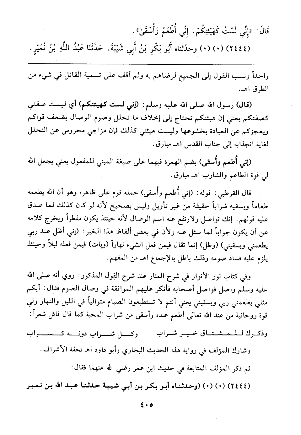 وفي كتاب نور الأنوار في شرح المنار عند شرح القول المذكور: روي أنه صلى الله عليه وسلم واصل فواصل أصحابه فانكر عليهم الموافقة في وصال الصوم فقال: أيكم مثلي يطعمني ربي ويسقيني يعني أنتم لا تستطيعون الصيام متواليًا في الليل والنهار ولي قوة روحانية من عند الله تعالى أطعم عنده وأسقى من شراب المحبة كما قال قائل شعرًا: