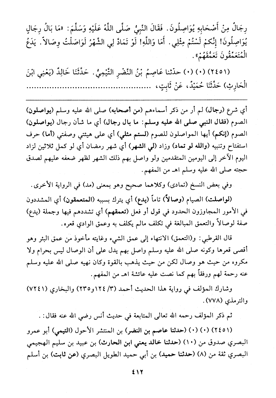 (٢٤٥١) (٠) (٠) (حدثنا عاصم بن النضر) بن المنتشر الأحول (التيمي) أبو عمرو البصري صدوق من (١٠) (حدثنا خالد يعني ابن الحارث) بن عبيد بن سليم الهجيمي البصري ثقة من (٨) (حدثنا حميد) بن أبي حميد الطويل البصري (عن ثابت) بن أسلم