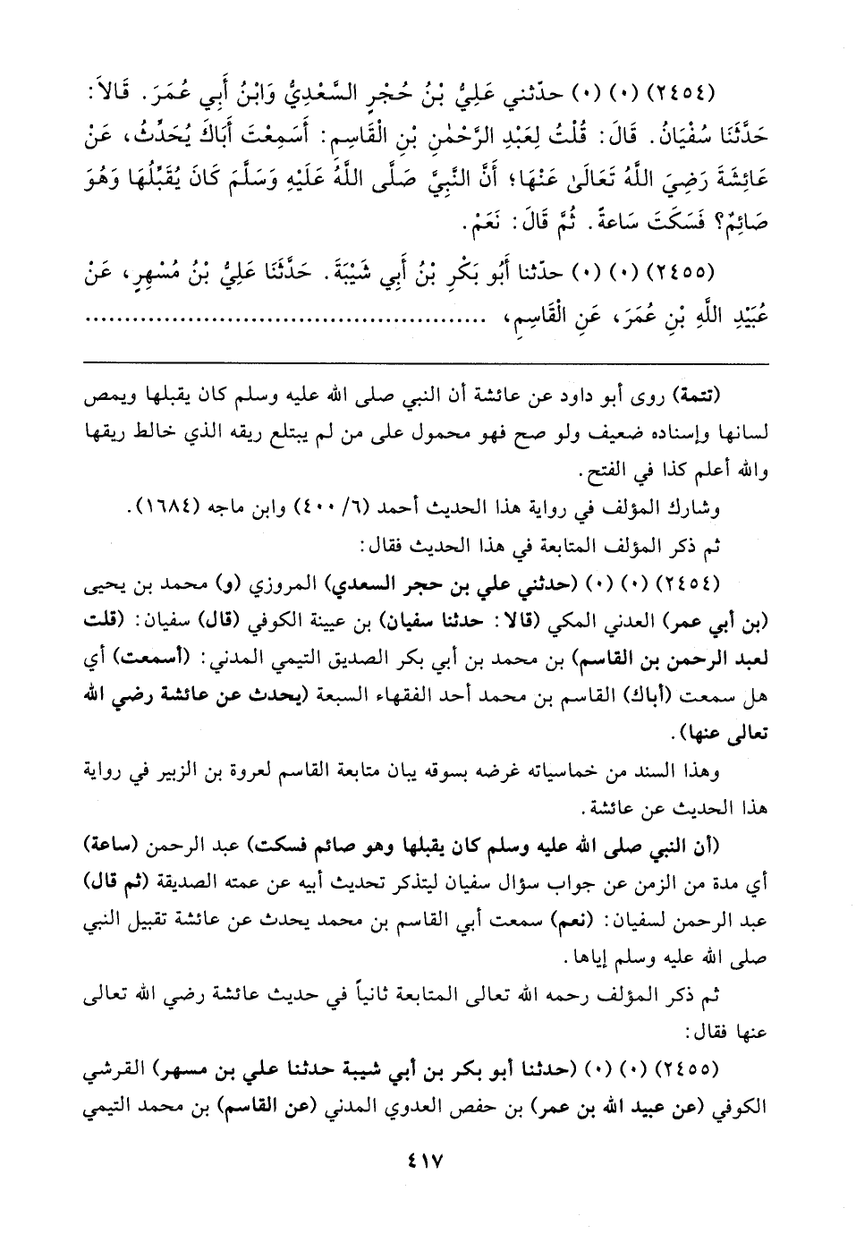 (٢٤٥٤) (٠) (٠) حدَّثني عَلِيُّ بْنُ حُجْرِ السَّعْدِيُّ وَابْنُ أَبِي عُمَرَ. قَالا: حَدَّثَنَا سُفْيَانُ. قَال: قُلْتُ لِعَبْدِ الرَّحْمنِ بْنِ الْقَاسِمِ: أَسَمِعْتَ أَبَاكَ يُحَدِّثُ، عَنْ عَائِشَةَ رَضِيَ اللهُ تَعَالى عَنْهَا؛ أَن النَّبِي صَلَّى اللهُ عَلَيهِ وَسَلَّمَ كَانَ يُقَبِّلُهَا وَهُوَ صَائِمٌ؟ فَسَكَتَ سَاعةً. ثُمَّ قَال: نَعَمْ.