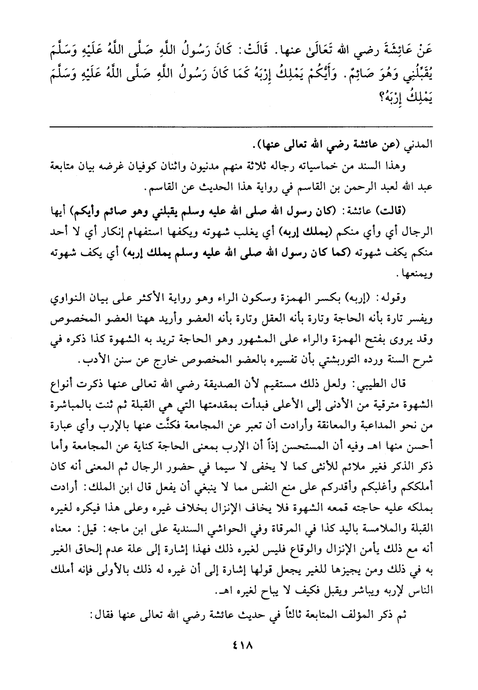 عَنْ عَائِشَةَ رضي الله تَعَالى عنها. قَالتْ: كَانَ رَسُولُ اللهِ صَلَّى اللهُ عَلَيهِ وَسَلَّمَ يُقَبِّلُنِي وَهُوَ صَائِمٌ. وَأَيُّكُمْ يَمْلِكُ إِرْبَهُ كَمَا كَانَ رَسُولُ اللهِ صَلَّى اللهُ عَلَيهِ وَسَلَّمَ يَمْلِكُ إِرْبَهُ؟