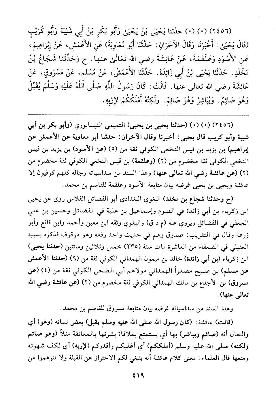 (٢٤٥٦) (٠) (٠) حدَّثنا يَحْيَى بْنُ يَحْيَى وَأَبُو بَكْرِ بْنُ أَبِي شَيبَةَ وَأَبُو كُرَيبٍ (قَال يَحْيَى: أَخْبَرَنَا وَقَال الآخَرَانِ: حَدَّثَنَا أَبُو مُعَاويةَ) عَنِ الأعمَشِ، عَنْ إِبْرَاهِيمَ، عَنِ الأَسْوَدِ وَعَلْقَمَةَ، عَنْ عَائِشَةَ رضي الله تَعَالى عنها. ح وَحَدَّثَنَا شُجَاعُ بْنُ مَخْلَدٍ. حَدَّثَنَا يَحْيَى بْنُ أَبِي زَائِدَةَ. حَدَّثَنَا الأَعْمَشُ، عَنْ مُسْلِمٍ، عَن مَسْرُوقٍ، عَنْ عَائِشَةَ رضي الله تعالى عنها. قَالتْ: كَانَ رَسُولُ اللهِ صَلَّى اللهُ عَلَيهِ وَسَلَّمَ يُقَبِّلُ وَهُوَ صَائِمٌ. وَيُبَاشِرُ وَهُوَ صَائِمٌ. ولَكِنَّهُ أَمْلَكُكُمْ لإِرْبِهِ