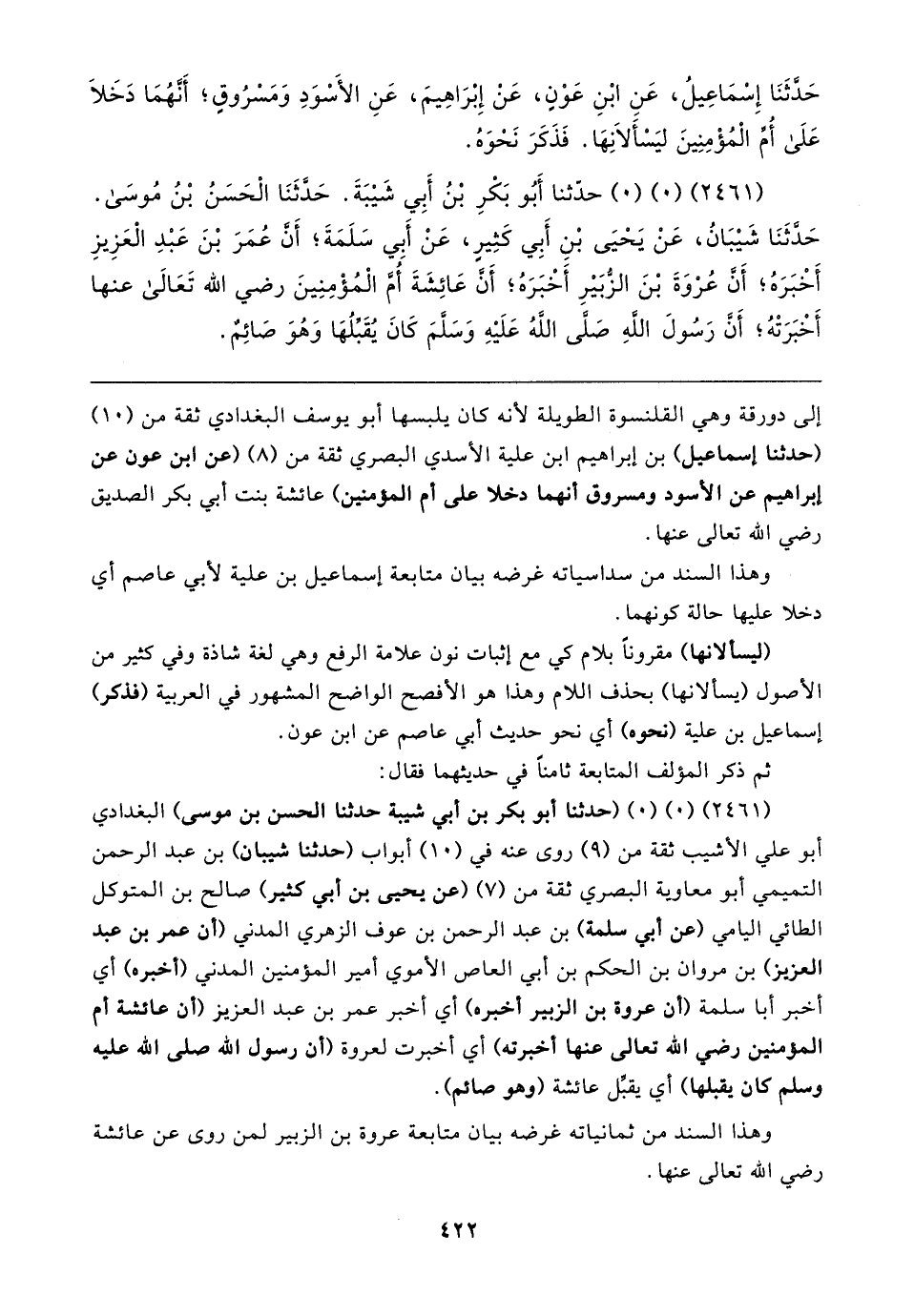 (٢٤٦١) (٠) (٠) (حدثنا أبو بكر بن أبي شيبة حدثنا الحسن بن موسى) البغدادي أبو علي الأشيب ثقة من (٩) روى عنه في (١٠) أبواب (حدثنا شيبان) بن عبد الرحمن التميمي أبو معاوية البصري ثقة من (٧) (عن يحيى بن أبي كثير) صالح بن المتوكل الطائي اليامي (عن أبي سلمة) بن عبد الرحمن بن عوف الزهري المدني (أن عمر بن عبد العزيز) بن مروان بن الحكم بن أبي العاص الأموي أمير المؤمنين المدني (أخبره) أي أخبر أبا سلمة (أن عروة بن الزببر أخبره) أي أخبر عمر بن عبد العزيز (أن عائشة أم المومنين رضي الله تعالى عنها أخبرته) أي أخبرت لعروة (أن رسول الله صلى الله عليه وسلم كان يقبلها) أي يقبِّل عائشة (وهو صائم).