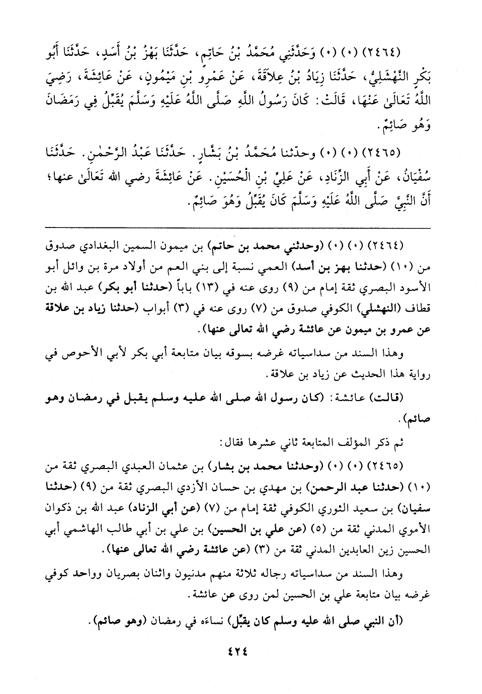(٢٤٦٤) (٠) (٠) (وحدثني محمد بن حاتم) بن ميمون السمين البغدادي صدوق من (١٠) (حدثنا بهز بن أسد) العمي نسبة إلى بني العم من أولاد مرة بن وائل أبو الأسود البصري ثقة إمام من (٩) روى عنه في (١٣) بابا (حدثنا أبو بكر) عبد الله بن قطاف (النهشلي) الكوفي صدوق من (٧) روى عنه في (٣) أبواب (حدثنا زياد بن علاقة عن عمرو بن ميمون عن عائشة رضي الله تعالى عنها).