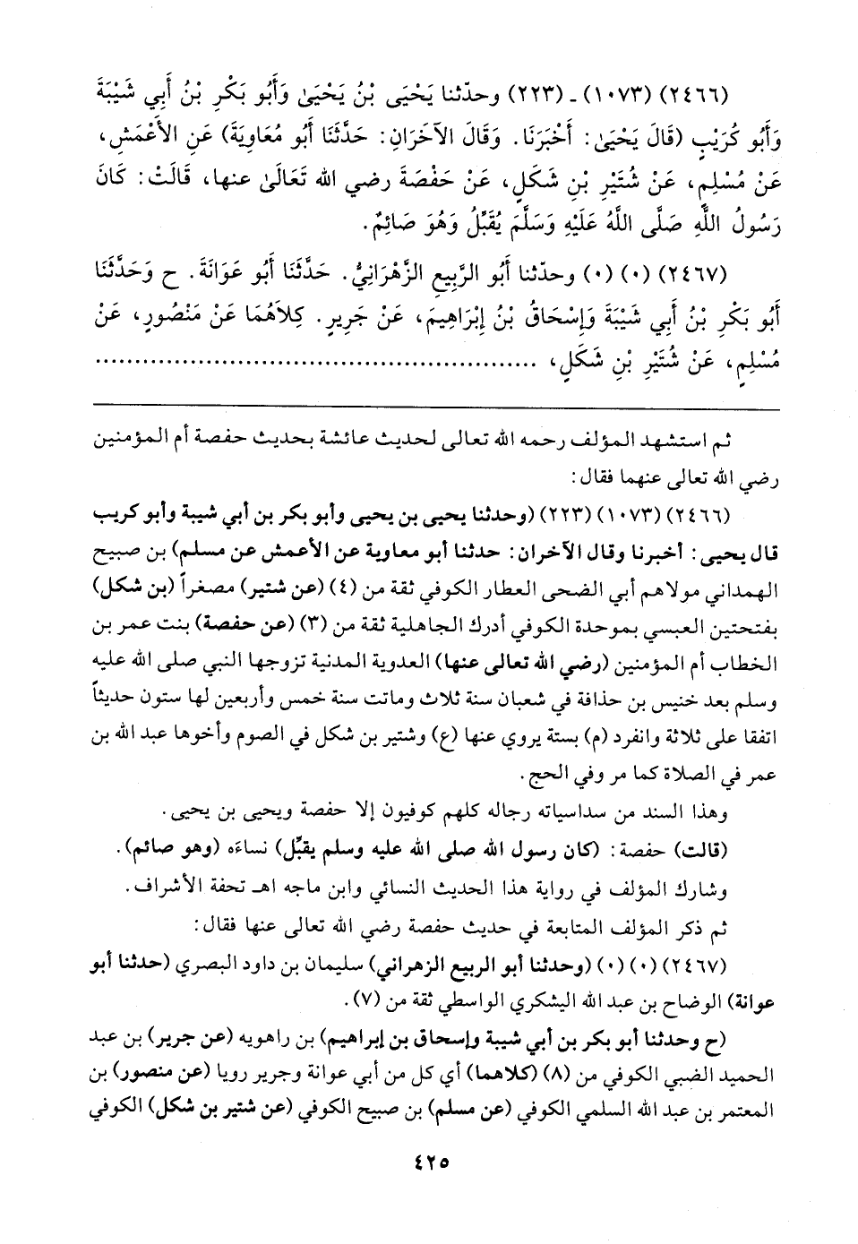 (٢٤٦٦) (١٠٧٣) (٢٢٣) (وحدثنا يحيى بن يحيى وأبو بكر بن أبي شيبة وأبو كريب قال يحيى أخبرنا وقال الآخران: حدثنا أبو معاوية عن الأعمش عن مسلم) بن صبيح الهمداني مولاهم أبي الضحى العطار الكوفي ثقة من (٤) (عن شتير) مصغرًا (بن شكل) بفتحتين العبسي بموحدة الكوفي أدرك الجاهلية ثقة من (٣) (عن حفصة) بنت عمر بن الخطاب أم المؤمنين (رضي الله تعالى عنها) العدوية المدنية تزوجها النبي صلى الله عليه وسلم بعد خنيس بن حذافة في شعبان سنة ثلاث وماتت سنة خمس وأربعين لها ستون حديثًا اتفقا على ثلاثة وانفرد (م) بستة يروي عنها (ع) وشتير بن شكل في الصوم وأخوها عبد الله بن عمر في الصلاة كما مر وفي الحج.