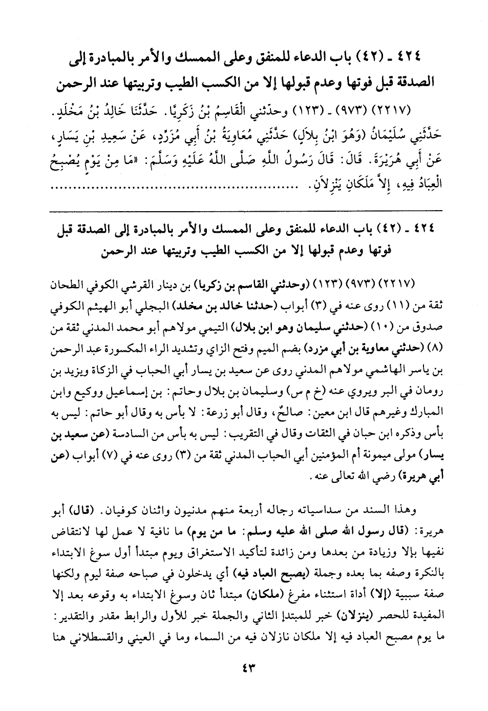 (٢٢١٧) (٩٧٣) - (١٢٣) وَحَدَّثَنِي الْقَاسِمُ بْنُ زَكَرِيَّا. حَدَّثَنَا خَالِدُ بْنُ مَخْلَدٍ. حَدَّثَنِي سُلَيمَانُ (وَهُوَ ابْنُ بِلالٍ) حَدَّثَنِي مُعَاويَةُ بْنُ أَبِي مُزَرِّدٍ، عَنْ سَعِيدِ بْنِ يَسَارٍ، عَنْ أَبِي هُرَيرَةَ. قَال: قَال رَسُولُ اللهِ صلى الله عليه وسلم: "مَا مِنْ يَوْمٍ يُصْبِحُ الْعِبَادُ فِيهِ, إِلَّا مَلَكَانِ يَنْزِلانِ