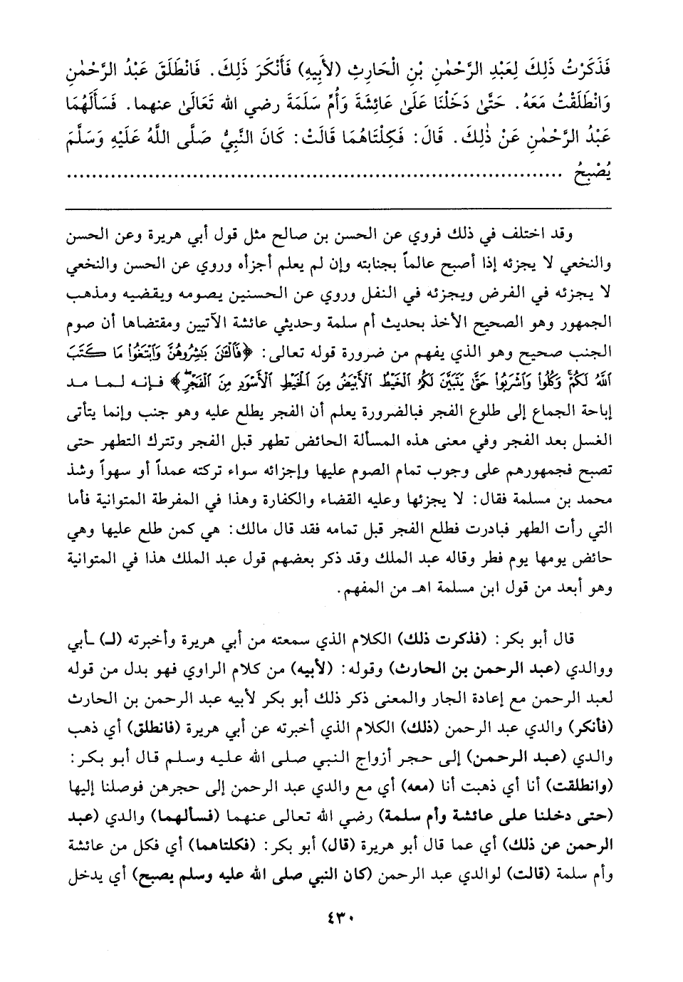 فَذَكَرْتُ ذَلِكَ لِعَبْدِ الرَّحمنِ بْنِ الْحَارِثِ (لأَبِيهِ) فَأنْكَرَ ذَلِكَ. فَانْطَلَقَ عَبْدُ الرَّحْمنِ وَانْطَلَقْتُ مَعَهُ. حَتى دَخَلْنَا عَلَى عَائِشَةَ وَأُمِّ سَلَمَةَ رضي الله تَعَالى عنهما. فَسَأَلَهُمَا عَبْدُ الرَّحْمنِ عَنْ ذلِكَ. قَال: فَكِلْتَاهُمَا قَالتْ: كَانَ النبي صلى الله عَلَيهِ وَسلمَ يُصْبحُ