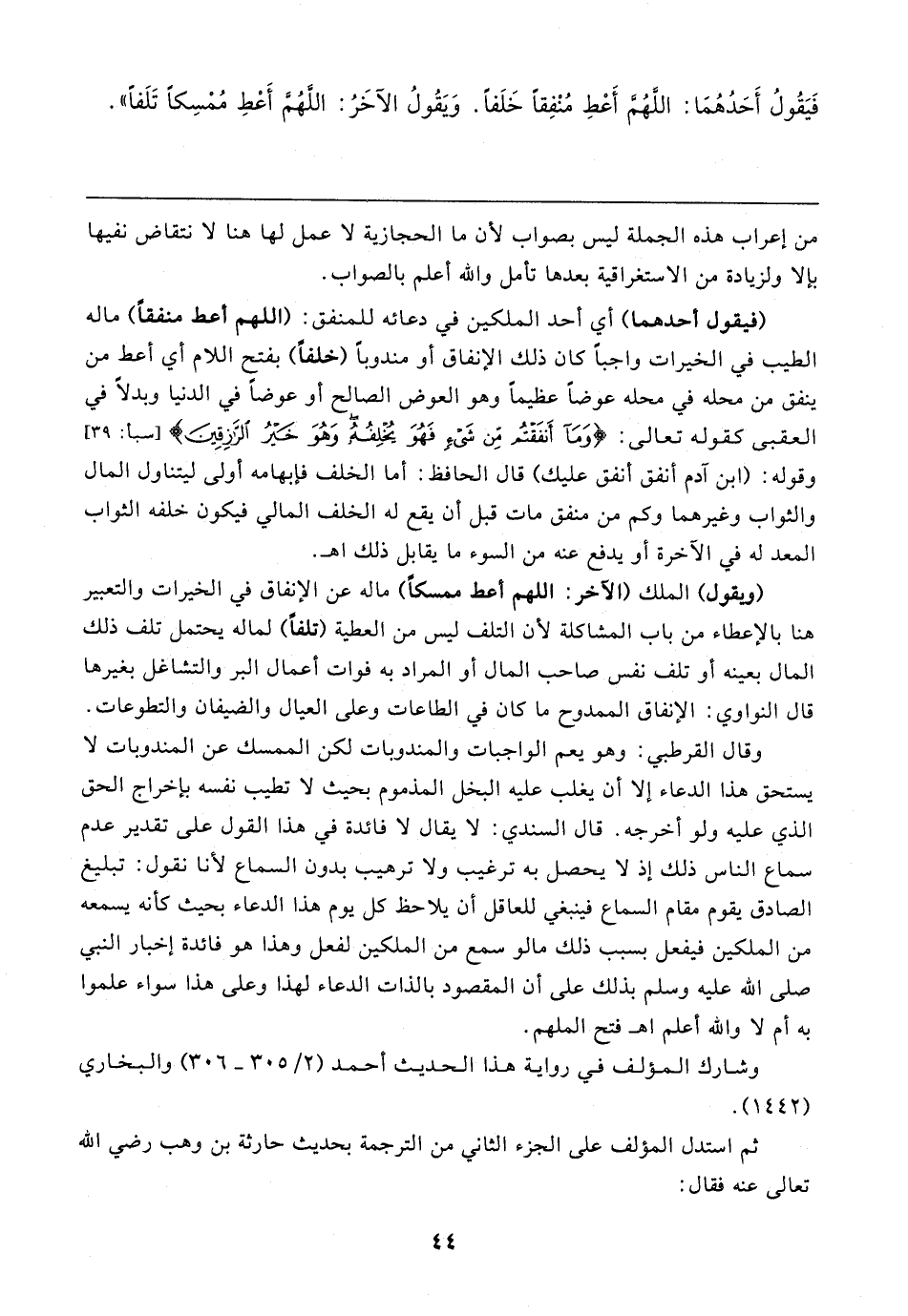 وقال القرطبي: وهو يعم الواجبات والمندوبات لكن الممسك عن المندوبات لا يستحق هذا الدعاء إلا أن يغلب عليه البخل المذموم بحيث لا تطيب نفسه بإخراج الحق الذي عليه ولو أخرجه. قال السندي: لا يقال لا فائدة في هذا القول على تقدير عدم سماع الناس ذلك إذ لا يحصل به ترغيب ولا ترهيب بدون السماع لأنا نقول: تبليغ الصادق يقوم مقام السماع فينبغي للعاقل أن يلاحظ كل يوم هذا الدعاء بحيث كأنه يسمعه من الملكين فيفعل بسبب ذلك ما لو سمع من الملكين لفعل وهذا هو فائدة إخبار النبي صلى الله عليه وسلم بذلك على أن المقصود بالذات الدعاء لهذا وعلى هذا سواء علموا به أم لا والله أعلم اهـ فتح الملهم.