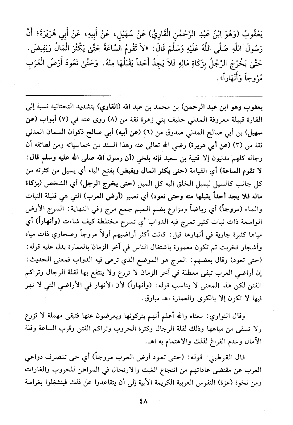 يَعْقُوبُ (وَهُوَ ابْنُ عَبْدِ الرَّحْمَنِ الْقَارِيُّ) عَنْ سُهَيلٍ، عَنْ أَبِيهِ، عَنْ أَبِي هُرَيرَةَ؛ أَنَّ رَسُولَ اللهِ صلى الله عليه وسلم قَال: "لَا تَقُومُ السَّاعَةُ حَتَّى يَكْثُرَ الْمَالُ وَيَفِيضَ حَتَّى يَخْرُجَ الرَّجُلُ بِزَكَاةِ مَالِهِ فَلَا يَجِدُ أَحَدًا يَقْبَلُهَا مِنْهُ. وَحَتَّى تَعُودَ أَرْضُ الْعَرَبِ مُرُوجًا وَأَنْهَارًا"