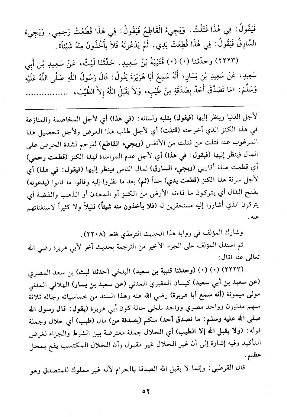 (٢٢٢٣) (٠) (٠) (وحدثنا قتيبة بن سعيد) البلخي (حدثنا ليث) بن سعد المصري (عن سعيد بن أبي سعيد) كيسان المقبري المدني (عن سعيد بن يسار) الهلالي المدني مولى ميمونة (أنه سمع أبا هريرة) رضي الله عنه وهذا السند من خماسياته رجاله ثلاثة منهم مدنيون وواحد مصري وواحد بلخي حالة كون أبي هريرة (يقول: قال رسول الله صلى الله عليه وسلم: ما تصدق أحد) منكم (بصدقة من) مال (طيب) أي حلال وجملة قوله: (ولا يقبل الله إلا الطيب) أي الحلال جملة معترضة بين الشرط والجزاء لغرض التأكيد وفيه إشارة إلى أن غير الحلال غير مقبول وأن الحلال المكتسب يقع بمحل عظيم.