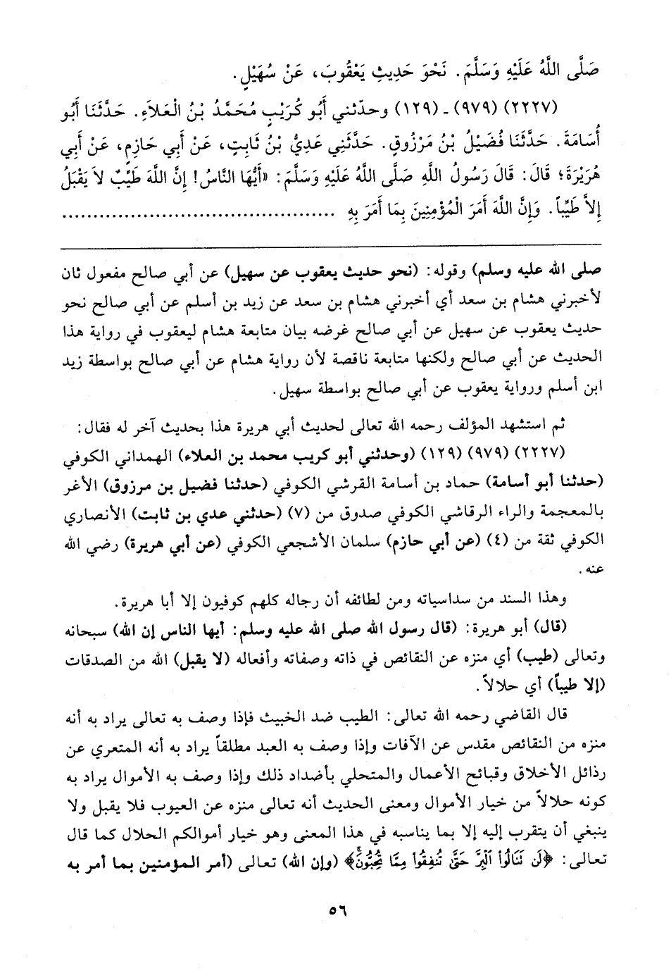 (٢٢٢٧) (٩٧٩) - (١٢٩) وَحَدَّثَنِي أَبُو كُرَيبٍ مُحَمَّدُ بْنُ الْعَلاءِ. حَدَّثَنَا أَبُو أُسَامَةَ. حَدَّثَنَا فُضَيلُ بْنُ مَرْزُوقٍ. حَدَّثَنِي عَدِيُّ بْنُ ثَابِتٍ، عَنْ أَبِي حَازِمٍ، عَنْ أَبِي هُرَيرَةَ؛ قَال: قَال رَسُولُ اللهِ صلى الله عليه وسلم: "أَيُّهَا النَّاسُ! إِنَّ اللَّهَ طَيِّبٌ لَا يَقْبَلُ إِلَّا طَيِّبًا. وَإِنَّ اللَّهَ أَمَرَ الْمُؤْمِنِينَ بِمَا أَمَرَ بِهِ