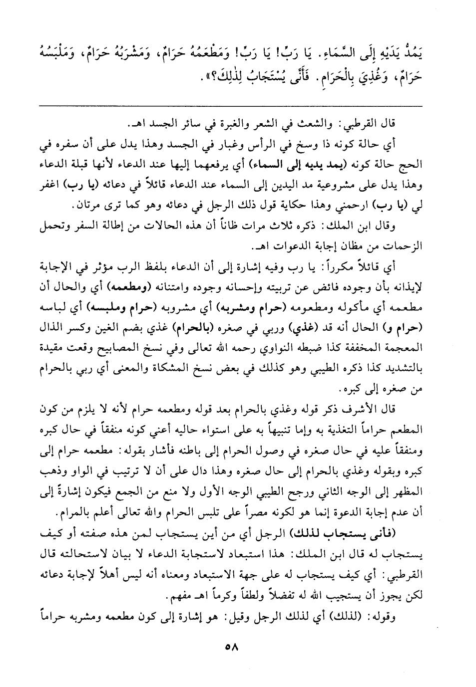 يَمُدُّ يَدَيهِ إِلَى السَّمَاءِ. يَا رَبِّ! يَا رَبِّ! وَمَطْعَمُهُ حَرَامٌ, وَمَشْرَبُهُ حَرَامٌ, وَمَلْبَسُهُ حَرَامٌ, وَغُذِيَ بِالْحَرَامِ. فَأَنَّى يُسْتَجَابُ لِذَلِكَ"