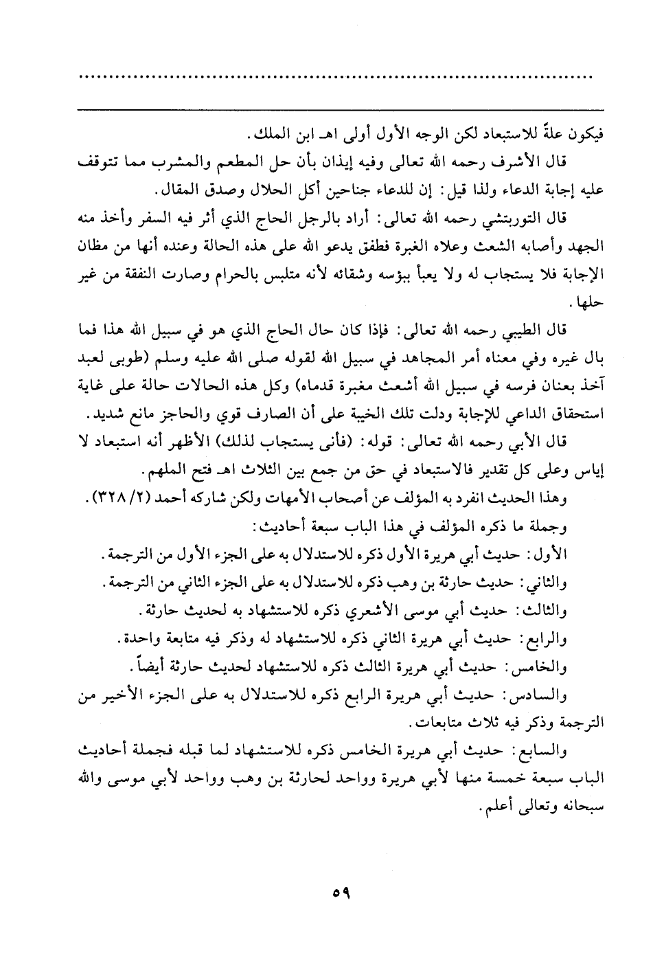 قال الطيبي رحمه الله تعالى: فإذا كان حال الحاج الذي هو في سبيل الله هذا فما بال غيره وفي معناه أمر المجاهد في سبيل الله لقوله صلى الله عليه وسلم (طوبى لعبد آخذ بعنان فرسه في سبيل الله أشعث مغبرة قدماه) وكل هذه الحالات حالة على غاية استحقاق الداعي للإجابة ودلت تلك الخيبة على أن الصارف قوي والحاجز مانع شديد.