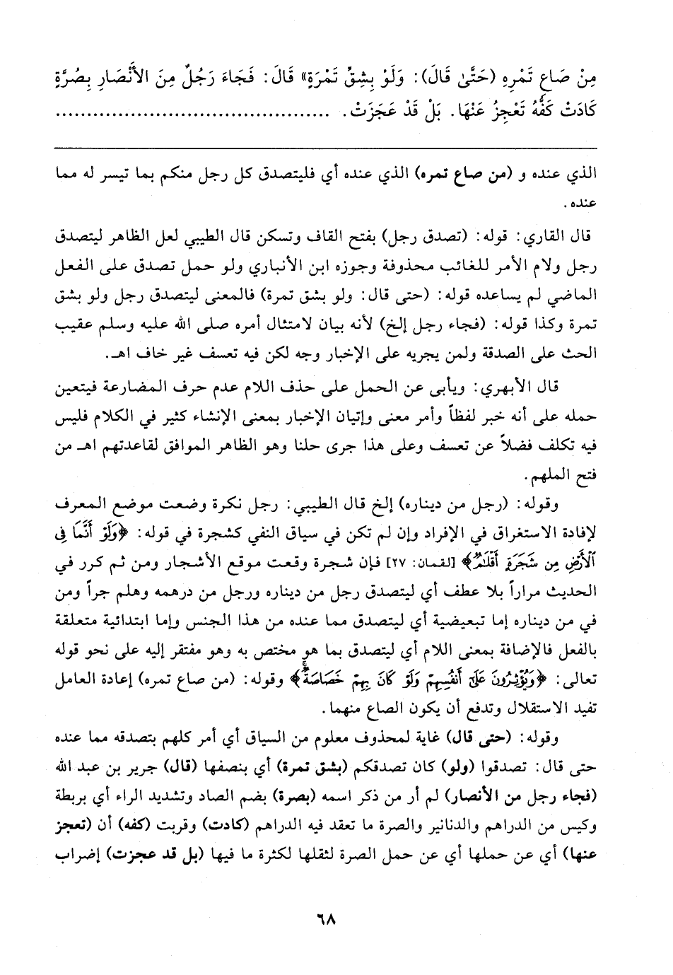 وقوله: (حتى قال) غاية لمحذوف معلوم من السياق أي أمر كلهم بتصدقه مما عنده حتى قال: تصدقوا (ولو) كان تصدقكم (بشق تمرة) أي بنصفها (قال) جرير بن عبد الله (فجاء رجل من الأنصار) لم أر من ذكر اسمه (بصرة) بضم الصاد وتشديد الراء أي بربطة وكيس من الدراهم والدنانير والصرة ما تعقد فيه الدراهم (كادت) وقربت (كفه) أن (تعجز عنها) أي عن حملها أي عن حمل الصرة لثقلها لكثرة ما فيها (بل قد عجزت) إضراب
