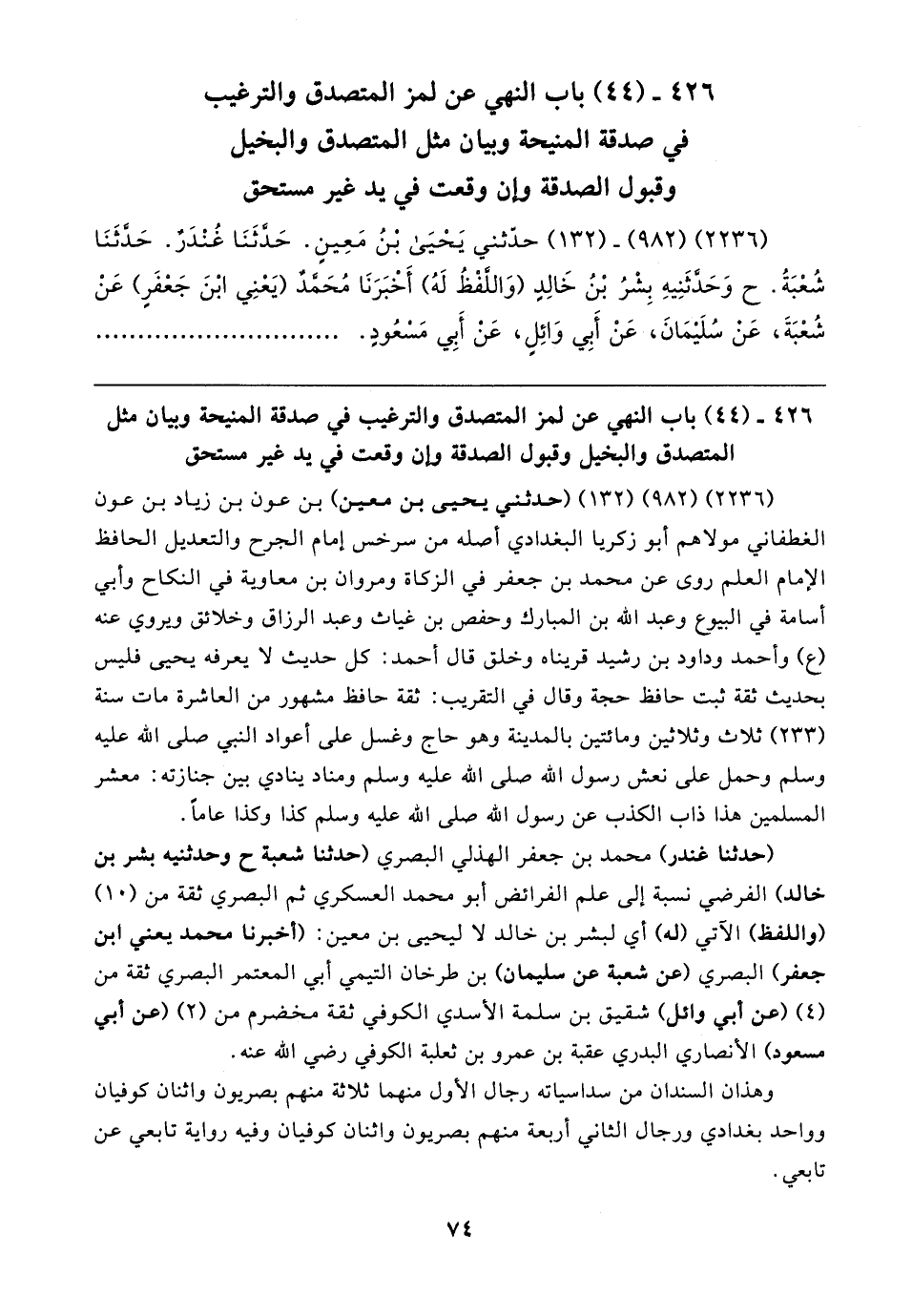 (٢٢٣٦) (٩٨٢) - (١٣٢) حَدَّثَنِي يَحْيَى بْنُ مَعِينٍ. حَدَّثَنَا غُنْدَرٌ. حَدَّثَنَا شُعْبَةُ. ح وَحَدَّثَنِيهِ بِشْرُ بْنُ خَالِدٍ (وَاللَّفْظُ لَهُ) أَخْبَرَنَا مُحَمَّدٌ (يَعْنِي ابْنَ جَعْفَرٍ) عَنْ شُعْبَةَ، عَنْ سُلَيمَانَ، عَنْ أَبِي وَائِلٍ، عَنْ أَبِي مَسْعُودٍ