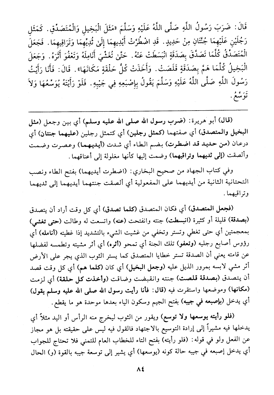 قَال: ضَرَبَ رَسُولُ الله صَلى الله عَلَيهِ وَسَلمَ "مَثَلَ الْبَخِيلِ وَالْمُتَصَدِّقِ. كَمَثَلِ رَجُلَينِ عَلَيهِمَا جُنَّتَانِ مِنْ حَدِيدٍ. قَدِ اضْطرتْ أَيدِيهِمَا إِلَى ثُدِيِّهِمَا وَتَرَاقِيهِمَا. فَجَعَلَ الْمُتَصَدِّقُ كُلَّمَا تَصدَّقَ بِصَدَقَةٍ انْبَسَطَتْ عَنْهُ. حَتى تُغَشِّيَ أَنَامِلَهُ وَتَعفُوَ أَثَرَهُ. وَجَعَلَ الْبَخِيلُ كُلَّمَا هم بِصدَقَةٍ قَلَصَتْ. وَأَخَذَتْ كُلُّ حَلْقَةٍ مَكَانَها". قَال: فأنا رَأَيتُ رَسُولَ الله صَلَّى الله عَلَيهِ وَسَلمَ يَقُولُ بِإِصبَعِهِ فِي جَيبِهِ. فَلَوْ رَأَيتَهُ يُوَسِّعُها وَلَا تَوَسعُ
