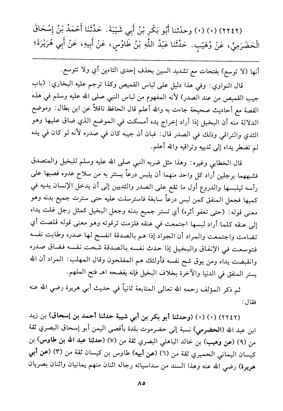 (٢٢٤٢) (٠) (٠) (وحدثنا أبو بكر بن أبي شيبة حدثنا أحمد بن إسحاق) بن زيد بن عبد الله (الحضرمي) نسبة إلى حضرموت بلدة باقصى اليمن أبو إسحاق البصري ثقة من (٩) (عن وهيب) بن خالد الباهلي البصري ثقة من (٧) (حدثنا عبد الله بن طاوس) بن كيسان اليماني الحميري ثقة من (٦) (عن أبيه) طاوس بن كيسان ثقة من (٣) (عن أبي هريرة) رضي الله عنه وهذا السند من سداسياته رجاله اثنان منهم يمانيان واثنان بصريان