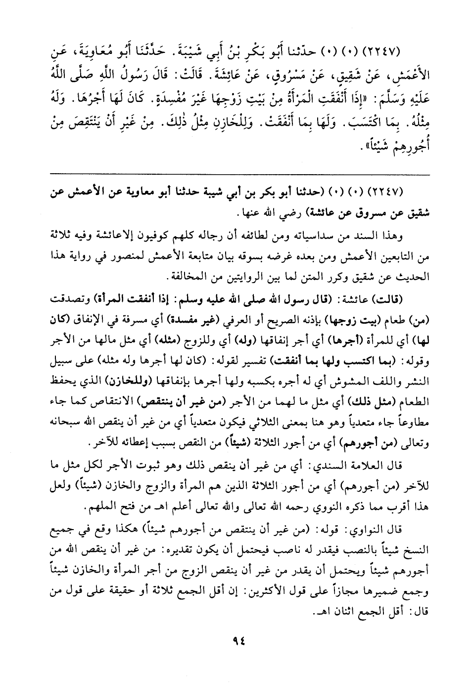 (٢٢٤٧) (٥) (٥) حدثنا أَبُو بَكْرِ بْنُ أَبِي شَيبَةَ. حَدَّثَنَا أَبُو مُعَاويةَ، عَنِ الأعمَشِ، عَنْ شَقِيقٍ، عَنْ مَسْرُوقٍ، عَنْ عَائِشَةَ. قَالتْ: قَال رَسُولُ الله صَلى الله عَلَيهِ وَسَلمَ: "إِذَا أَنْفَقَتِ الْمَرأَةُ مِنْ بَيتِ زَوْجِها غَيرَ مُفْسِدَةٍ. كَانَ لَها أَجْرُها. وَلَهُ مِثْلُهُ. بِمَا اكْتَسَبَ. وَلَها بِمَا أَنْفَقَتْ. وَللْخَازِنِ مِثْلُ ذلِكَ. مِنْ غَيرِ أنْ يَنْتَقِصَ مِنْ أُجُورِهِم شَيئا"