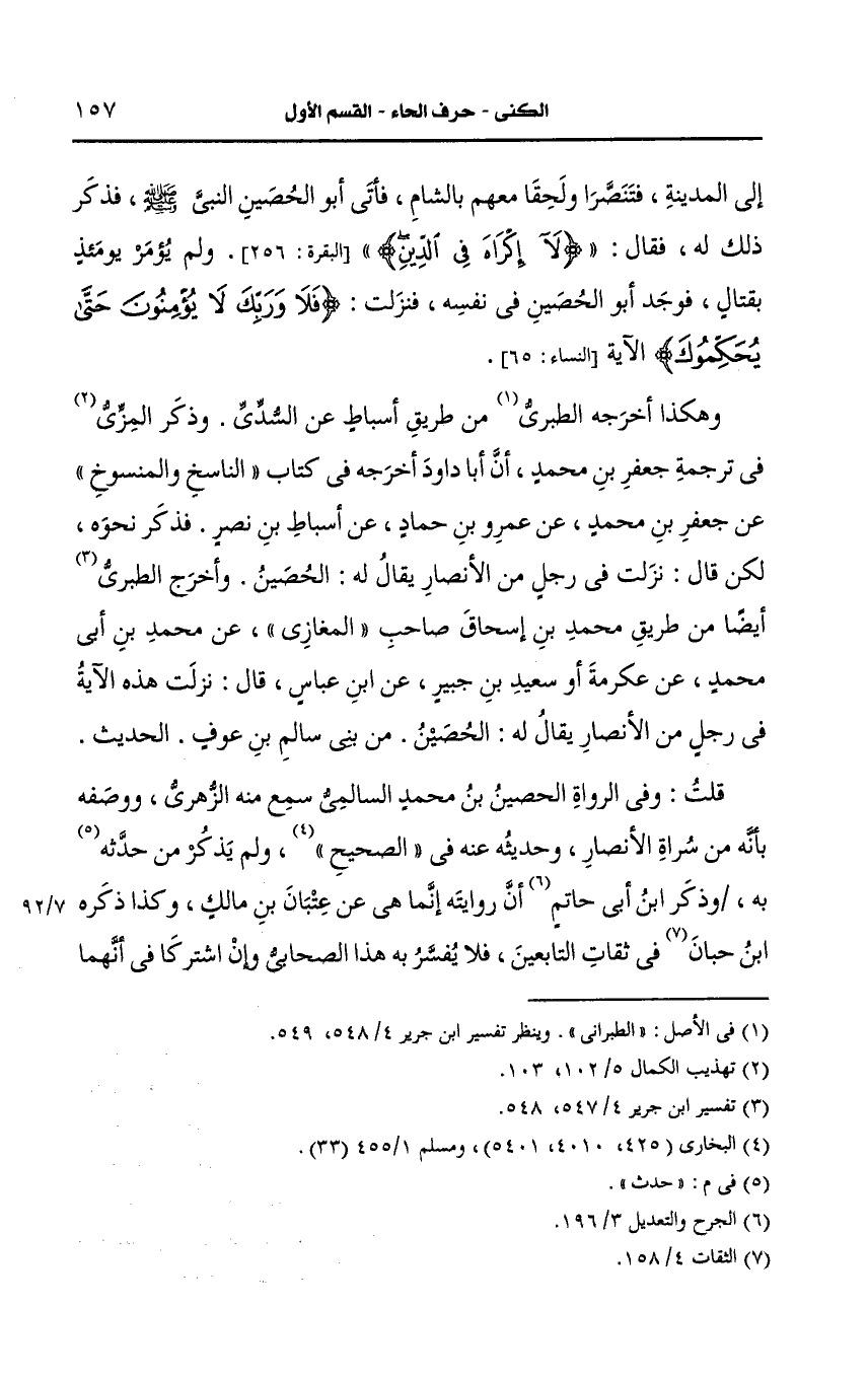 وأخرج الطَّبَرِي أيضًا من طريق محمد بن إسحاق صاحب المغازي، عَن محمد بن أبي محمد، عَن عكرمة أو سعيد بن جبير، عَن أبي عباس قال نزلت هذه الآية في رجل من الأنصار يُقَالُ لَهُ: الحصين من بني سالم بن عوف الحديث.