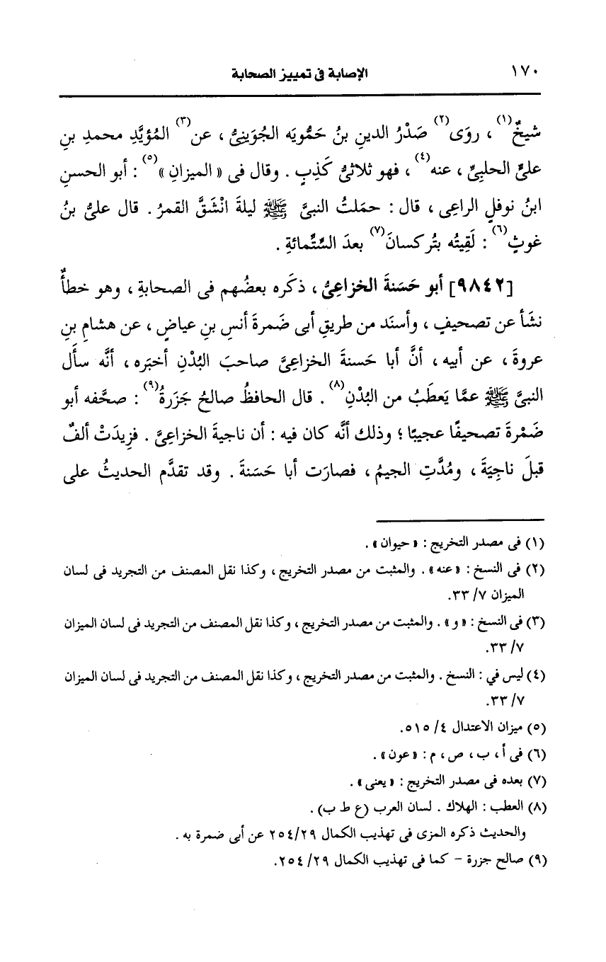 ذكره بعضهم في الصحابة وهو خطأ نشأ، عَن تصحيف وأسند من طريق أبي ضمرة أنس بن عياض، عَن هشام بن عُروَة، عَن أَبيه أن أبا حسنة الخُزاعيّ صاحب البدن أخبره أنه سأل النَّبيّ صَلى الله عَلَيه وسَلم عما يعطب من البدن قال الحافظ صالح جزرة صحفه أَبو ضمرة تصحيفا عجيبا وذلك أنه كان فيه أن ناجية الخُزاعيّ فزيدت ألف قبل ناجية ومدت الجيم فصارت أبا حسنة.