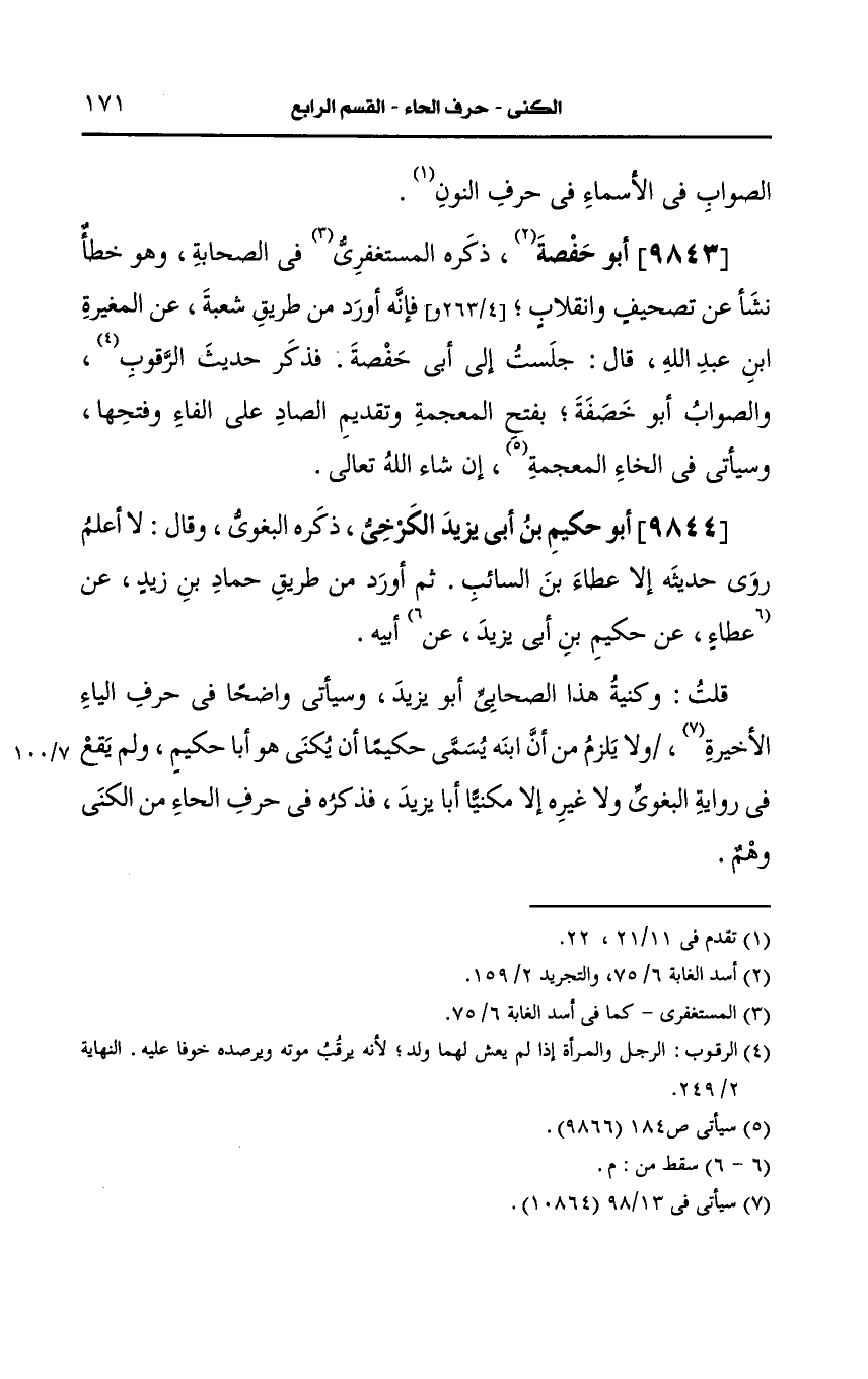 قلت: وكنية هذا الصحابي أَبو يزيد وسيأتي واضحا في حرف الياء الأخيرة ولا يلزم من أن ابنه يسمى حكيما أن يكنى هو أبا حكيم ولم يقع في رواية البغوي ولا غيره إلا مكنى أبا يزيد فذكره في حرف الحاء من الكنى وهم.