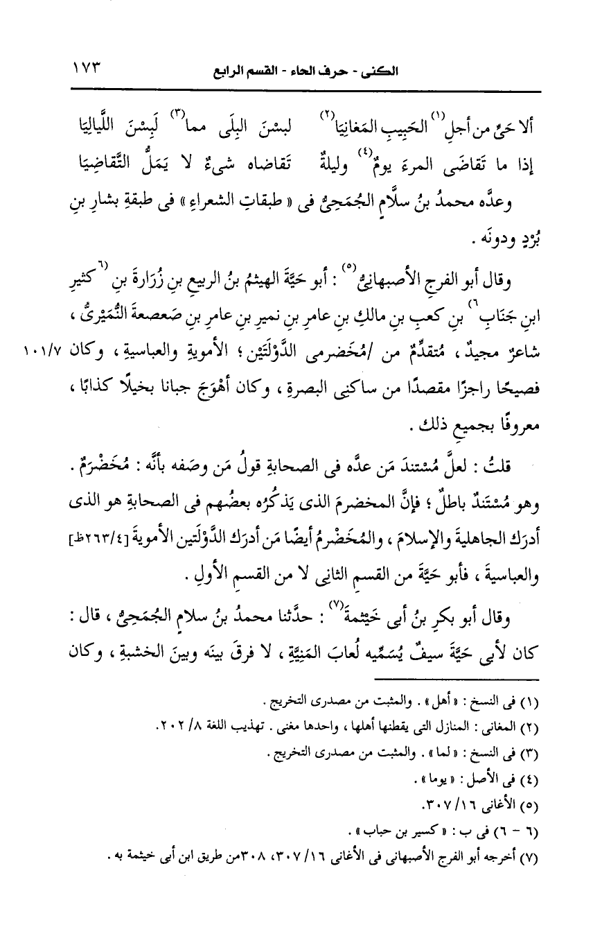 وقال أَبو الفرح الأصبهاني أَبو حية الهيثم بن ربيع بن زرارة بن كثير بن جناب بن كعب بن مالك بن عامر بن نمير بن عامر بن صعصعة النميري شاعر مجيد متقدم من مخضرمي الدولتين الأموية والعباسية، وكان فصيحا راجزا مقصدا من ساكني البصرة، وكان أهوج جبانا بخيلا كذابا معروفا بجميع ذلك.