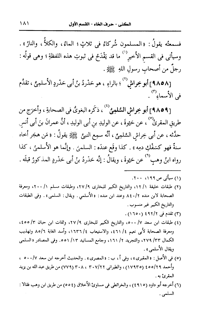وأخرج بن المقري، عَن حيوة، عَن الوليد بن أبي الوليد أن عمران بن أبي أنس حدثه، عَن أبي خراش السلمي أنه سمع النَّبيّ صَلى الله عَلَيه وسَلم يقول من هجر أخاه سنة فهو كسفك دمه.