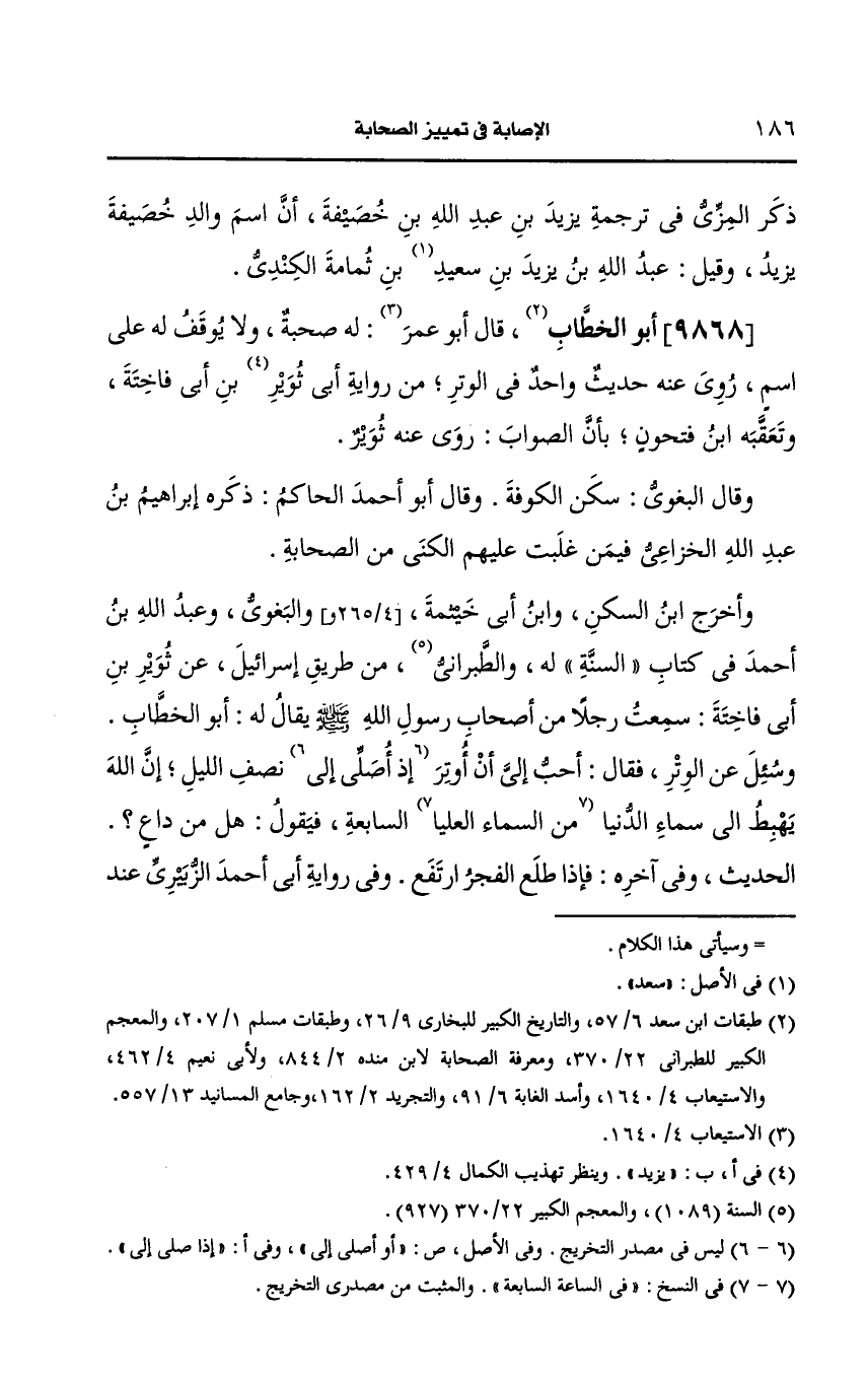وأخرج ابن السَّكَن، وابن أبي خيثمة والبغوي وعبد الله بن أَحمد في كتاب السنة له والطبراني من طريق إسرائيل، عَن ثوير بن أبي فاختة سمعت رجلا من أصحاب رسول الله صَلى الله عَلَيه وسَلم يُقَالُ لَهُ: أَبو الخطاب وسئل، عَن الوتر فقال أحب الي أن أوتر إذ أصلي الى نصف الليل إن الله يهبط الى السماء الدنيا في الساعة السابعة فيقول هل من داع الحديث.