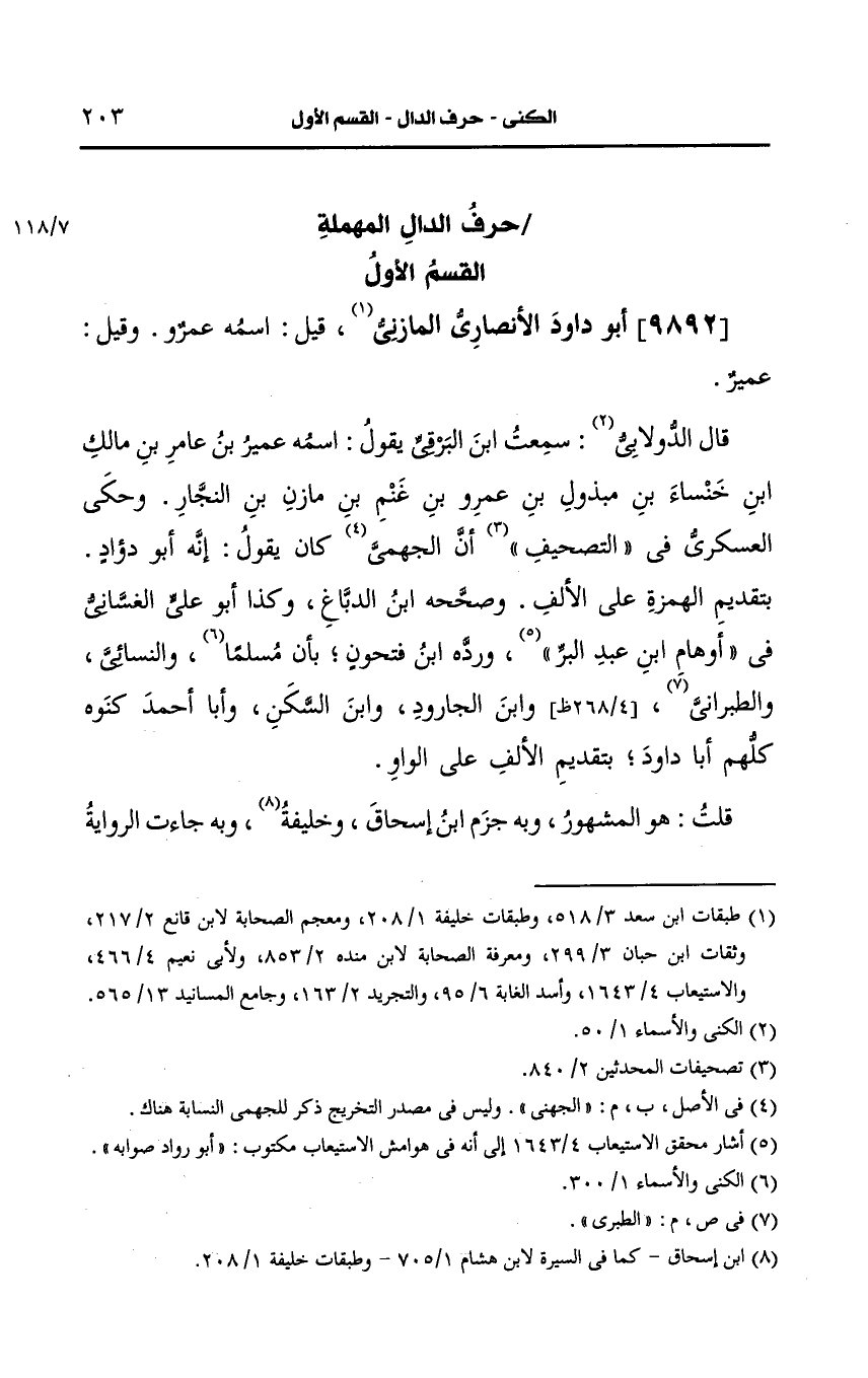 قال الدولابي سمعت بن البرقي يقول اسمه عمير بن عامر بن مالك بن خنساء بن مبذول بن عَمرو بن غنم بن مازن بن النجار وحكى العسكري في التصحيف أن الجهني كان يقول إنه أَبو داود بتقديم الهمزة على الألف وصححه بن الدباغ وكذا أَبو علي الغساني في أوهام ابن عَبد البَرِّ ورده ابن فتحون فإن مسلما والنسائي والطبري، وابن الجارود، وابن السَّكَن وأبا أَحمد كنوه كلهم أبا داود بتقديم الألف على الواو.