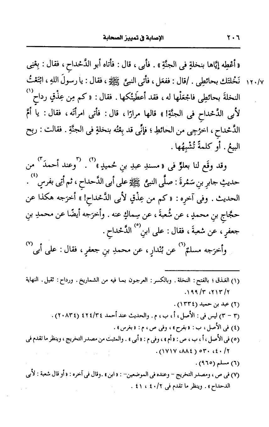 وقد وقع لنا بعلو في مسند عبد بن حميد من حديث جابر بن سمرة صلى النَّبيّ صَلى الله عَلَيه وسَلم على أبي الدحداح ثم أتى بغرس الحديث وفي آخره كم من عذق لأبي الدحداح أَخرجه هكذا، عَن حجاج بن محمد، عَن شعبة، عَن سِماك عنه.