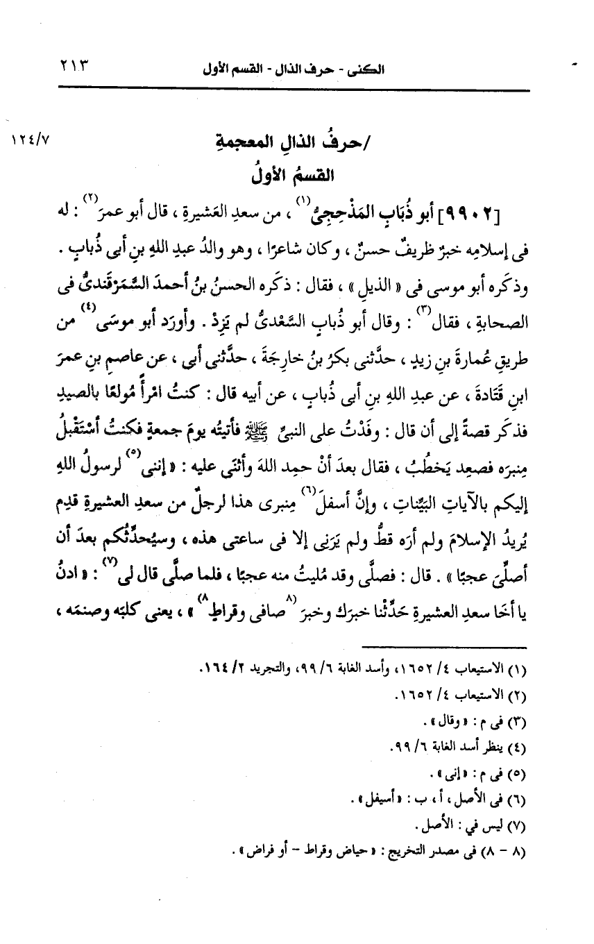 وأورد أَبو موسى من طريق عمارة بن زيد حدثني بكر بن خارجة حدثني أبي، عَن عاصم بن عمر بن قتادة، عَن عَبد الله بن أبي ذباب، عَن أَبيه قال كنت امرأ مولعا بالصيد فذكر قصة الى أن قال وفدت على النَّبِيِّ صَلى الله عَلَيه وسَلم فأتيته يوم جمعة فكنت أستقبل منبره فصعد يخطب فقال بعد أن حمد الله وأثنى عليه إني لرسول الله إليكم بالآيات البينات وإن أسفل منبري هذا لرجل من سعد العشيرة قدم يريد الإسلام ولم أره قط ولم يرني إلا في ساعتي هذه وسيحدثكم بعد أن أصلي عجبا قال فصلى وقد مليت منه عجبا فلما صلى قال لي ادن يا أخا سعد العشيرة، حَدَّثنا خبرك وخبر صافي وقراط يعني كلبه وصنمه قال فقمت على قدمي فحدثته حديثي حتى أتيت على آخره فرأيت وجه رسول الله صَلى الله عَلَيه وسَلم كأنه للسرور مذهب فدعاني الى الإسلام وقرأ علي القرآن فأسلمت الحديث.