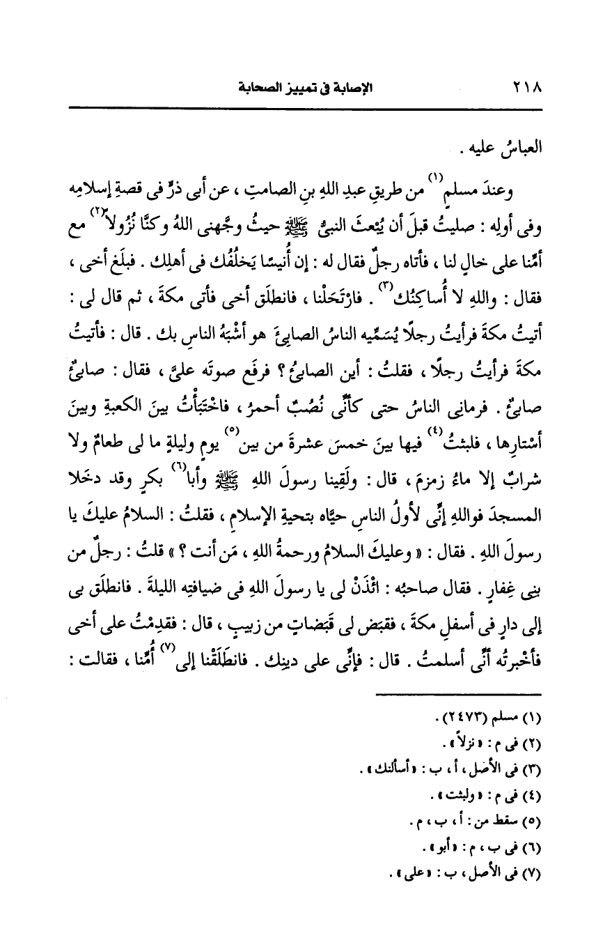 وعند مسلم من طريق عَبد الله بن الصامت، عَن أبي ذر في قصة إسلامه وفي أوله صليت قبل أن يبعث النَّبيّ صَلى الله عَلَيه وسَلم حيث وجهني الله وكنا نزلا مع أمنا على خال لنا فأتاه رجل فقال له إن أنيسا يخلفك في أهلك فبلغ أخي فقال والله لا أساكنك فارتحلنا فانطلق أخي فأتى مكة ثم قال لي أتيت مكة فرأيت رجلا يسميه الناس الصابىء هو أشبه الناس بك قال فأتيت مكة فرأيت رجلا فقلت أين الصابىء فرفع صوته علي فقال صابىء صابىء فرماني الناس حتى كأني نصب أحمر فاختبأت بين الكعبة وبين أستارها ولبثت فيها بين خمس عشرة من يوم وليلة ما لي طعام ولا شراب إلا ماء زمزم قال ولقينا رسول الله صَلى الله عَلَيه وسَلم، وأَبو بكر وقد دخلا المسجد فوالله إني لأول الناس حياة بتحية الإسلام فقلت السلام عليك يا رسول الله فقال وعليك السلام ورحمة الله من أنت فقلت رجل من بني غفار فقال صاحبه ائذن لي يا رسول الله في ضيافته الليلة فانطلق بي إلى دار في أسفل مكة فقبض لي قبضات من زبيب قال فقدمت على أخي فأخبرته أني أسلمت قال فإني على دينك فانطلقنا إلى أمنا فقالت فإني على دينكَما قَال وأتيت قومي فدعوتهم فتبعني بعضهم.