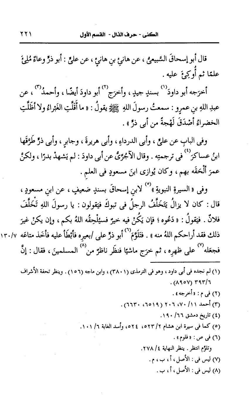 قال أَبو إسحاق السبيعي، عَن هانئ بن هانئ، عَن علي أَبو ذر وعاء ملىء علما ثم أوكىء عليه. أَخرجه أَبو داود بسند جيد وأَخرجه أَبو داود أيضًا وأَحمد، عَن عَبد الله بن عَمرو سمعت رسول الله صَلى الله عَلَيه وسَلم يقول ما أقلت الغبراء ولا أظلت الخضراء أصدق لهجة من أبي ذر".