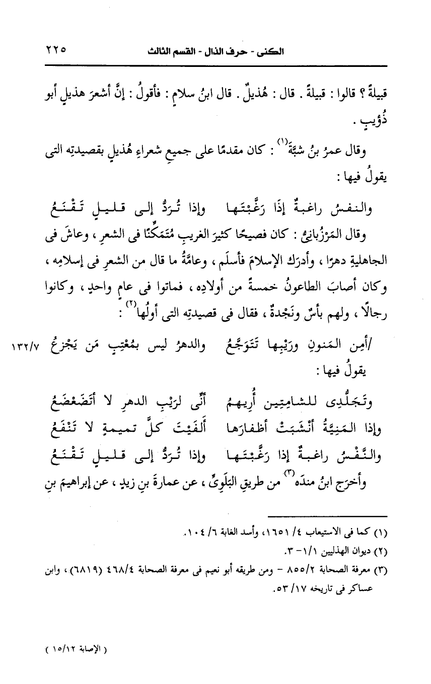 وقال عمر بن شيبة كان مقدما على جميع شعراء هذيل بقصيدته يقول فيها: