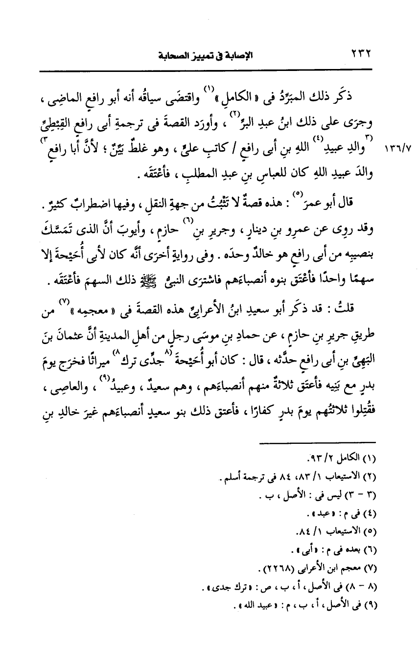قلت: قد ذكر أَبو سعيد بن الأعرابي هذه القصة في معجمه من طريق جرير بن حازم، عَن حماد بن موسى رجل من أهل المدينة أن عثمان بن البهي بن أبي رافع حدثه، قال: كان أَبو أحيحة جدي ترك ميراثا فخرج يوم بدر مع بنيه فأعتق ثلاثة منهم أنصباءهم وهم سعيد وعبيد الله والعاصي فقتلوا ثلاثتهم يوم بدر كفارا فأعتق ذلك بنو سعيد أنصباءهم غير خالد بن سعيد, لأنه كان غضب على أبي رافع بسبب أم ولد لأبي أحيحة أراد أن يتزوجها فنهاه خالد فعصاه فاحتمل عليه فلما أسلم أَبو رافع وهاجر كلم رسول الله صَلى الله عَلَيه وسَلم خالدا في أمره فأبى أن يعتق أو يهب أو يبيع ثم ندم بعد ذلك فوهبه للنبي صَلى الله عَلَيه وسَلم فأعتق صَلى الله عَلَيه وسَلم نصيبه فكان أَبو رافع يقول أنا مولى رسول الله صَلى الله عَلَيه وسَلم فلما ولي عَمرو بن سعيد بن العاص المدينة أرسل إلى البهي بن أبي رافع فقال له من مولاك قال رسول الله صَلى الله عَلَيه وسَلم فضربه مِئَة سوط ثم قال له من مولاك فقال مثلها حتى ضربه خمسمِئَة سوط فلما خاف أن يموت قال أنا مولاكم فلما قتل عبد الملك بن مَروان عَمرو بن سعيد بن العاص مدحه البهي بن أبي رافع وهجا عَمرو بن سعيد فهذا يبين أن صاحب هذه القصة غير أبي رافع والد عَبد الله بن أبي رافع إذ ليس في ولده أحد يسمى البهي.