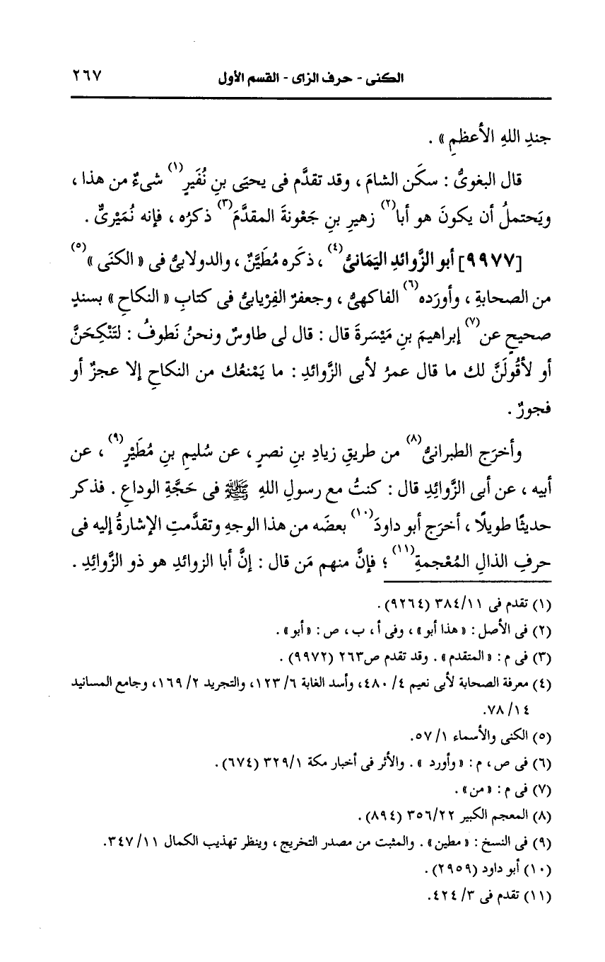 وأخرج الطَّبَرَانِيُّ من طريق زياد بن نصر، عَن سليم بن مطين، عَن أَبيه، عَن أبي الزوائد قال كنت مع رسول الله صَلى الله عَلَيه وسَلم في حجة الوداع فذكر حديثا طويلا أخرج أَبو داود بعضه من هذا الوجه وتقدمت الإشارة اليه في حرف الذال المعجمة فإن منهم من قال إن أبا الزوائد هو ذو الزوائد ممن ذكره في الكنى البُخارِيّ وذكر بهذا الإسناد طرفا من هذا الحديث.