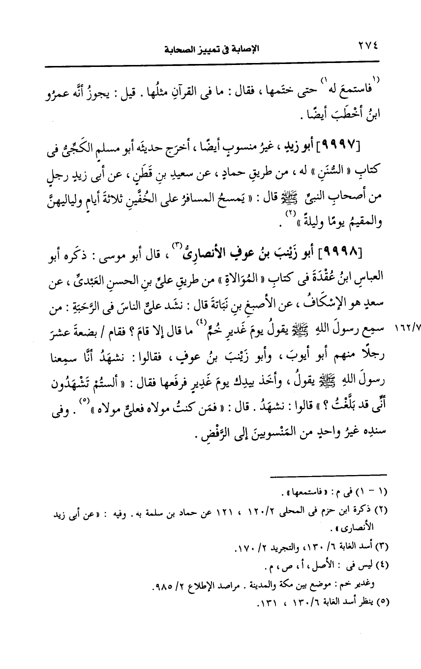 قال أَبو موسى ذكره أَبو العباس بن عقدة في كتاب الموالاة من طريق علي بن الحسن العبدي، عَن سعد هو الإسكاف، عَن الأصبغ بن نباتة قال نشد على الناس في الرحبة من سمع رسول الله صَلى الله عَلَيه وسَلم يقول يوم غدير ما قال إلا قام فقام بضعة عشر رجلا منهم أَبو أيوب، وأَبو زينب بن عوف فقالوا نشهد أنا سمعنا رسول الله صَلى الله عَلَيه وسَلم يقول وأخذ بيدك يوم غدير فرفعها فقال ألستم تشهدون أني قد بلغت قالوا نشهد قال فمن كنت مولاه فعلي مولاه وفي سنده غير واحد من المنسوبين الى الرفض.