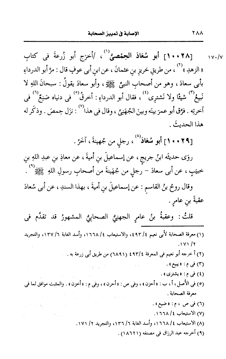 أخرج أَبو زُرعة في كتاب الزهد من طريق حريز بن عثمان، عَن ابن أبي عوف قال مر أَبو الدرداء بأبي سعاد وهو من أصحابِ النَّبِيِّ صَلى الله عَلَيه وسَلم، وأَبو سعاد يقول سبحان الله لا يبيع شيئا ولا يشتري فقال أَبو الدرداء أخزن في دنياه ضيع في آخرته فرق أَبو عمر بينه وبين الجهني وقال هذا نزل حمص وذكر له هذا الحديث.